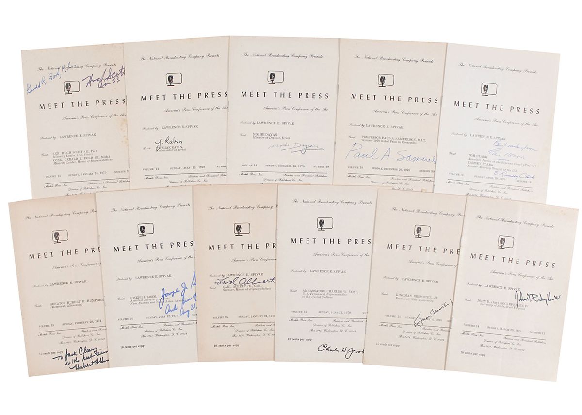 Collection of 11 programs for episodes of Meet the Press, 1970–71, 5.5 x 8.5, each signed on the front cover in ink by the featured guest. Signers are: Gerald R. Ford and Hugh Scott, Moshe Dayan, Yitzhak Rabin, Kingman Brewster, Jr., John D. Rockefeller IV, Charles W. Yost, Carl Albert, Joeph J. Sisco, Tom Clark and Ramsey Clark, Paul A. Samuelson, and Hubert H. Humphrey. In overall fine condition, with moderate foxing to the Gerald Ford program.