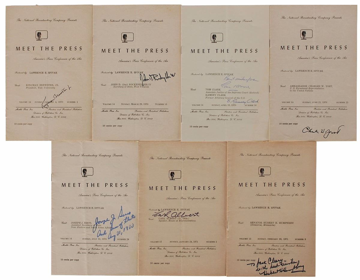 Collection of seven programs for episodes of Meet the Press, 1970–71, 5.5 x 8.5, each signed on the front cover in ink by the featured guest. Signers are: Kingman Brewster, Jr.; John D. Rockefeller IV; Charles W. Yost; Carl Albert; Joseph J. Sisco; Tom Clark and Ramsey Clark; and Hubert H. Humphrey. In overall fine condition.