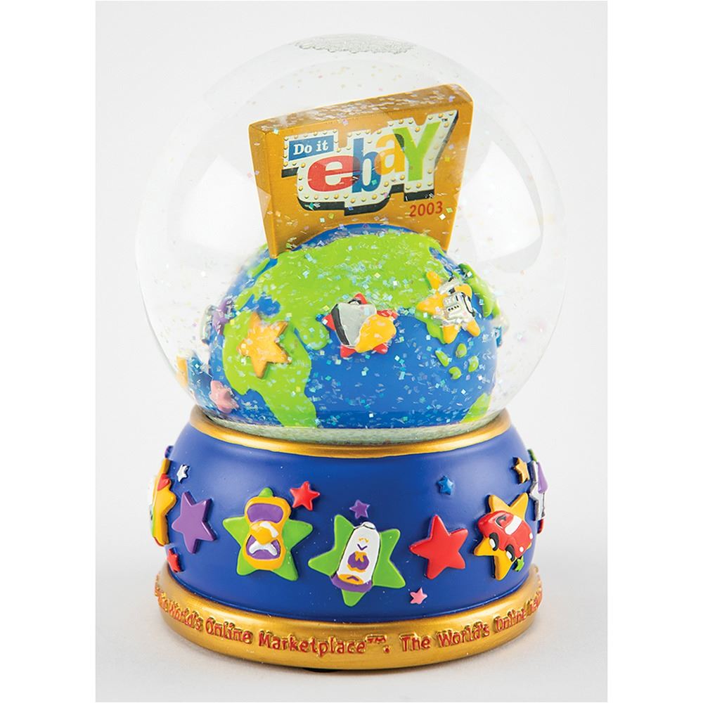 Very desirable limited edition 2003 eBay collectible snow globe, numbered 1/2000, standing 5.5 in height, signed on the underside in black felt tip by Meg Whitman, who served as the companys president and CEO from 1998 to 2008. During Whitman's 10 years with the company, she oversaw its expansion from 30 employees and $4 million in annual revenue, to more than 15,000 employees and $8 billion in annual revenue. Includes the original limited edition box and certificate of authenticity, both of which have matching edition numbers. In fine condition, with wear to box.