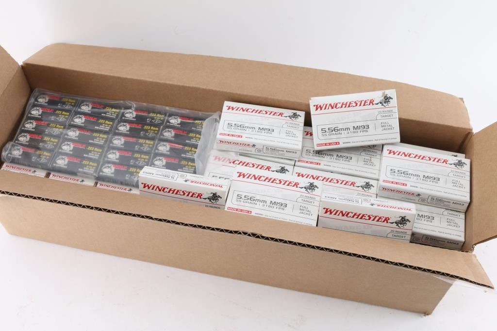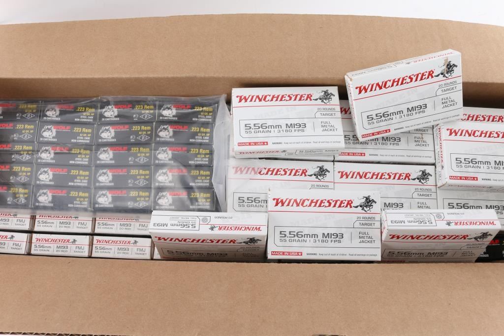 Approx. 1500 rounds total of factory new ammunition. 1000 rds of Wolf .223 Remington, 62 Gr. steel case, non-corrosive & 500 rds of brass case Winchester 5.56 M193, 55 Gr. FMJ . All in factory boxes.