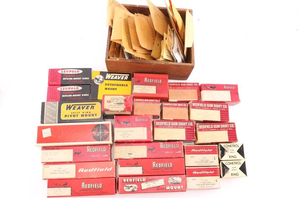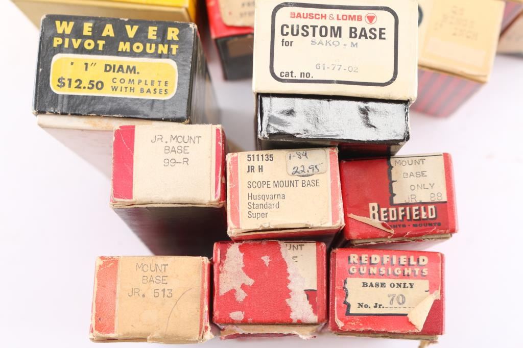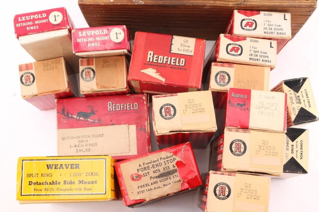 Includes models: Quick-switch mount 99-R, (2) 760, No. 40-D, 336-R, 70-A 1" rings, (2) 1" split (low) scope rings, (3) quick-switch 1" rings, (6) scope mount bases (JR. 88, JR. S, JR. 70, JR. H, JR. 513, JR. 99-R), No. 37-S. In original factory boxes. All very good to excellent condition. (2) Conetrol Gunnur 1" split, high scope rings. (2) Leupold 1" Detacho-Mount rings. (1) Freeland fore-end stop 52M. (1) Weaver split ring 1" detachable side mount. (1) Weaver 1" pivot mount. (1) Bausch & Lomb (for Sako M). Includes other Williams, Jaeger, O.S.E, Redfield, Lyman sights, mounts and more.
