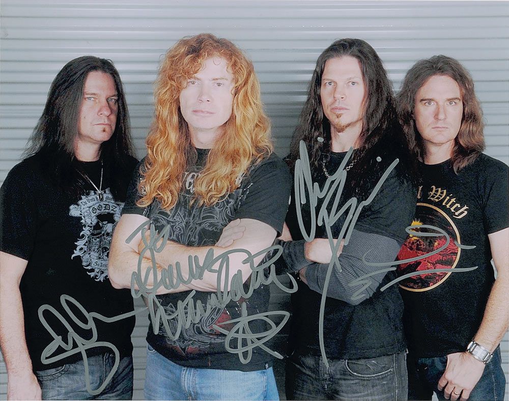Color satin-finish 14 x 11 group photo, signed in silver ink by all four members pictured: Dave Mustaine, Dave Ellefson, Chris Broderick, and Shawn Drover. In fine condition.