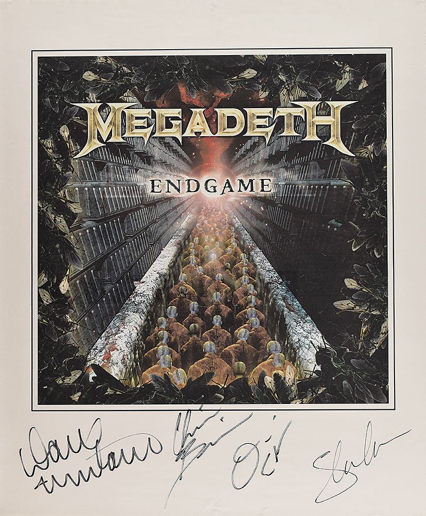 Pair of color prints for the Megadeth albums Endgame and United Abominations, 15.75 x 19 and 19.75 x 15.75, both posters signed in the lower border in black felt tip by Dave Mustaine, in addition to other members like Chris Broderick, Shawn Drover, Glen Drover, and James LoMenzo. Rolled and in overall fine condition.