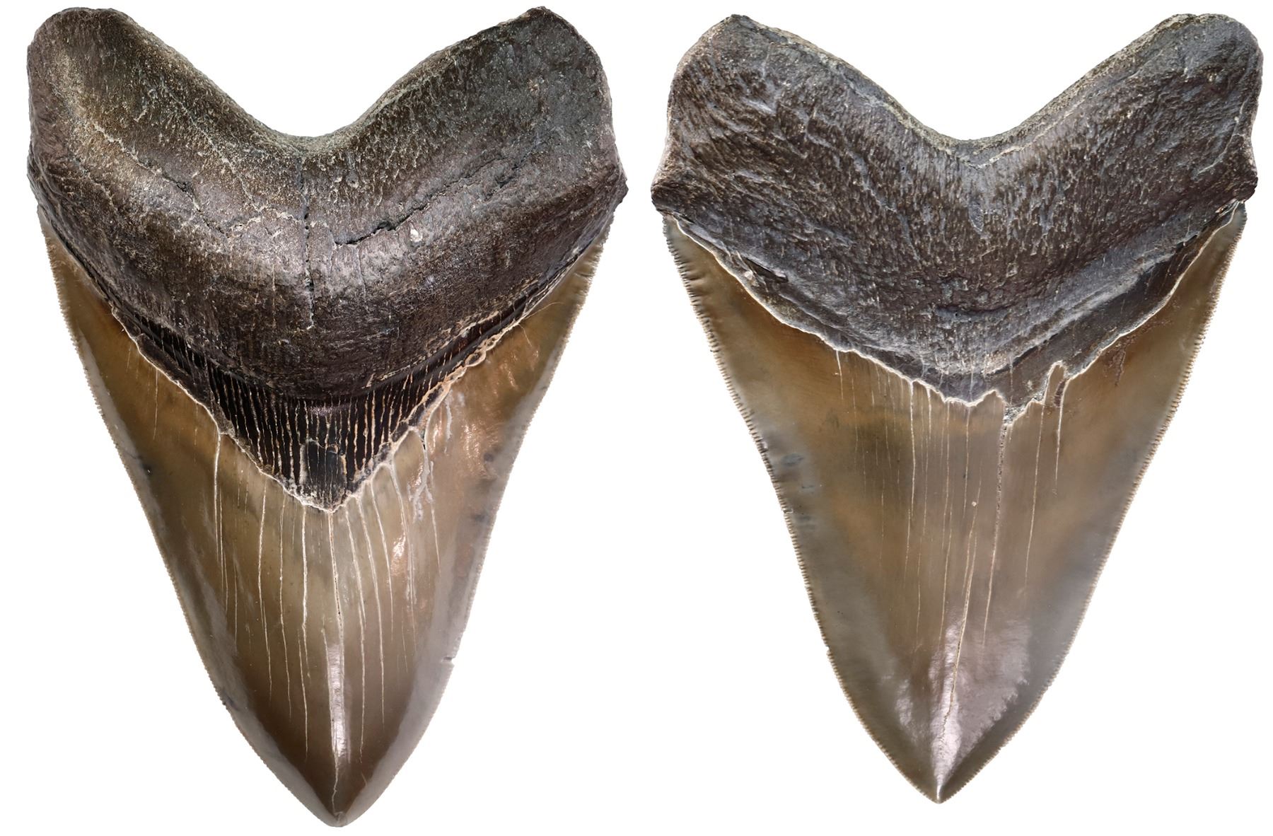 Megalodon (giant shark) tooth, Miocene epoch, approx. 15 to 5 million years old, found off the Atlantic coast of the United States. 379 grams. 4" x 5½". Complete and very well preserved fossilized tooth from Carcharocles megalodon (meaning "big tooth," an extinct species of shark), light gray polished enamel, intact serrated edges, black matte root.