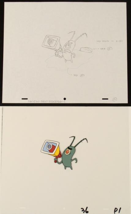 To create production cels, the original animator's drawing is transferred onto an acetate cel (by hand-inking and/or photo copying). The cel is then hand-painted on the reverse side. The cel and drawing are ready to be matted and framed. The animator's notations are at the bottom of the cel and top and bottom of the drawing. On the cel Plankton is missing his mouth!