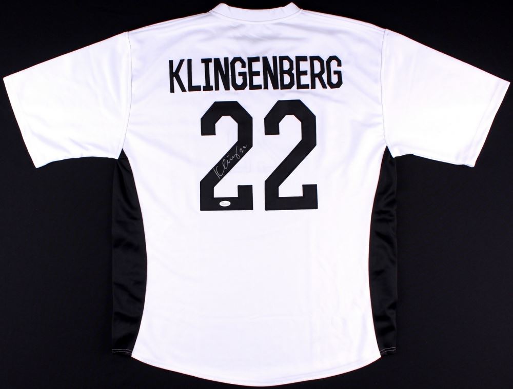 Custom on-field style jersey. Everything is sewn on, size XL. Hand-signed in silver paint pen by Meghan Klingenberg (Team USA). The autograph includes an official James Spence Authentication (JSA) hologram and matching COA for authenticity purposes. The signing of this item was witnessed by JSA.