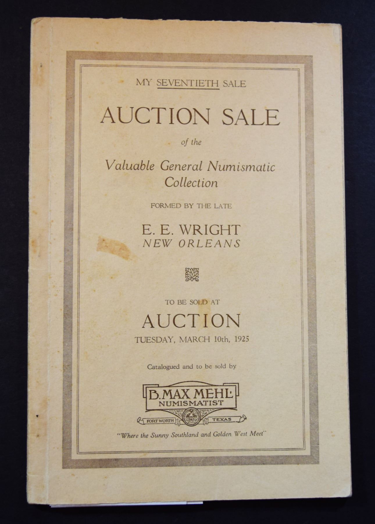 Mehel, B. Max. MY SEVENTIETH SALE. AUCTION SALE OF THE VALUABLE GENERAL NUMISMATIC COLLECTION FORMED BY THE LATE E.E. WRIGHT. March 10, 1925. 1-1515 Lots. 12mo. This auction sale catalog includes numismatic material from the United States, Mexico, Latin America, Europe and other foreign countries from the collection of E.E. Wright of New Orleans. Included in the sale are coins, medals and paper money principally of the United States, a fine line of U.S. rare war medals, ancient gold and silver, Pioneer and Territorial Gold, rare silver, copper and currency, extensive U.S. Pattern coins, Silver coins of Central and South America, and the Rebel Coinage of Mexico. Fort Worth, original brown card covers, soiled, 67 pages, HMW, ex Charles Davis Sale April 17, 1989 Lot 294, ex Charles Davis Sale February 29, 1992 Lot 243, ex Money Tree Sale No. 30 Lot 754, ex David Sklow Sale No. 12 Lot 716, Gengerke 70[418]. Lot weight: 0 lbs 5oz. Subject(s): United States, European, Mexican, Latin American, World Coinage.