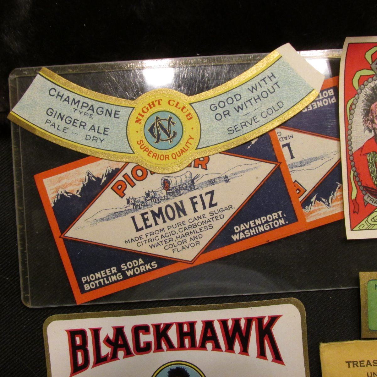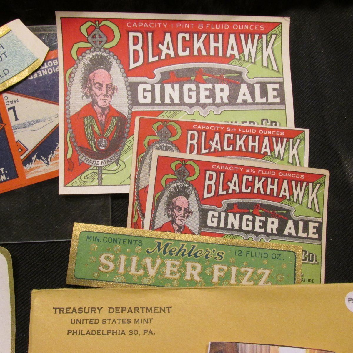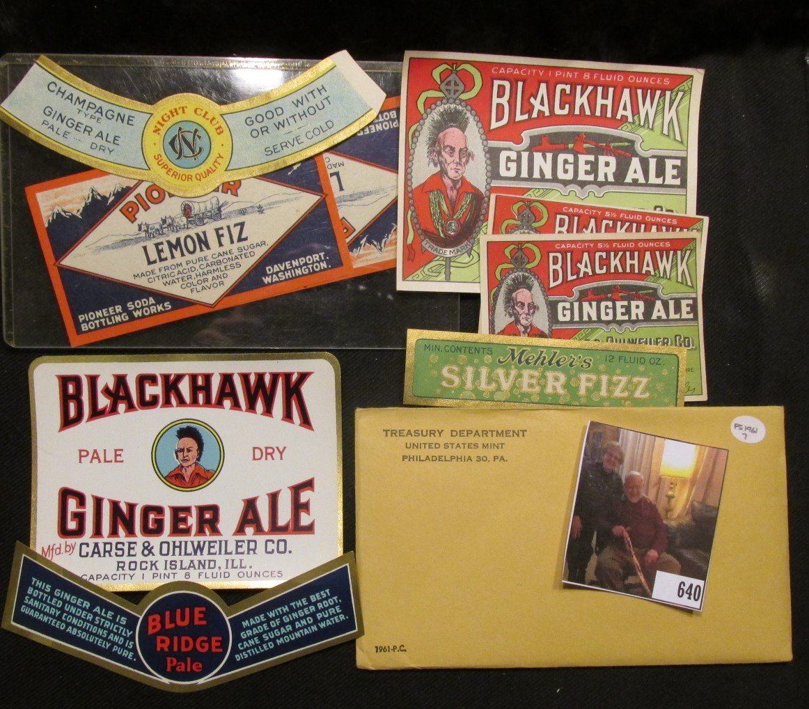 "Mehler's Silver Fizz" label; "Blue Ridge Pale" label; "Night Club…Champagne Type Ginger Ale" label; pair of "Pioneer Lemon Fiz…Pioneer Soda Bottling Works Davenport, Washington" label; several "Blackhawk Ginger Ale" labels; and an unopened 1961 U.S. Proof Set in original envelope.