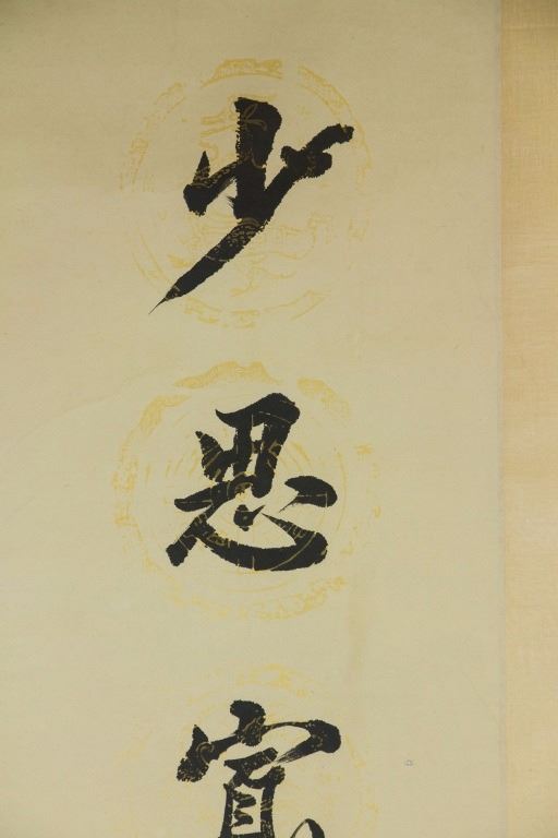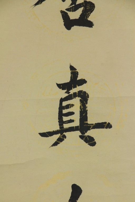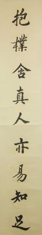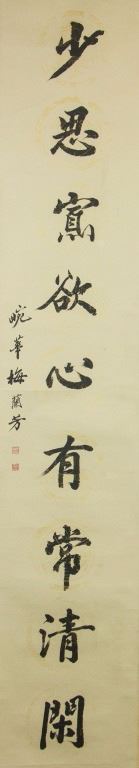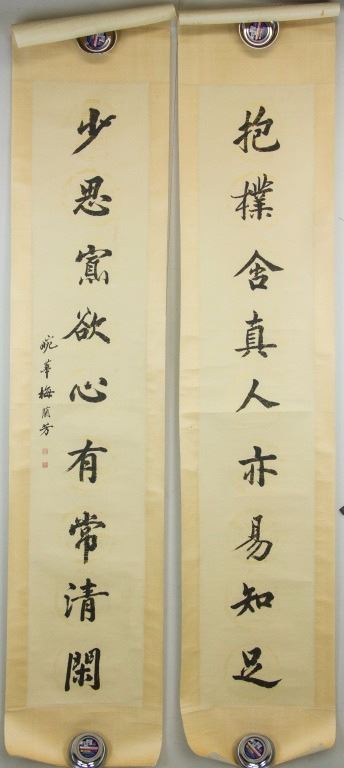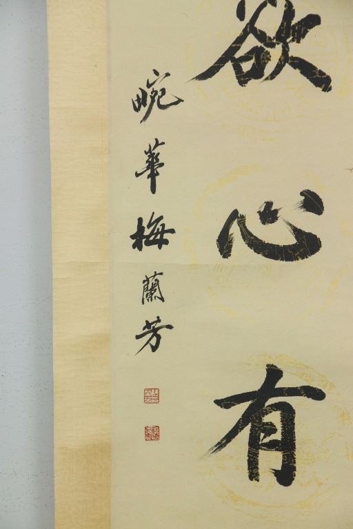 Pair of Chinese character calligraphy in kaishu; Chinese ink on paper roll; signed Mei Lanfang (1894-1961); inscribed with 2 artist seals; 170 cm × 32 cm