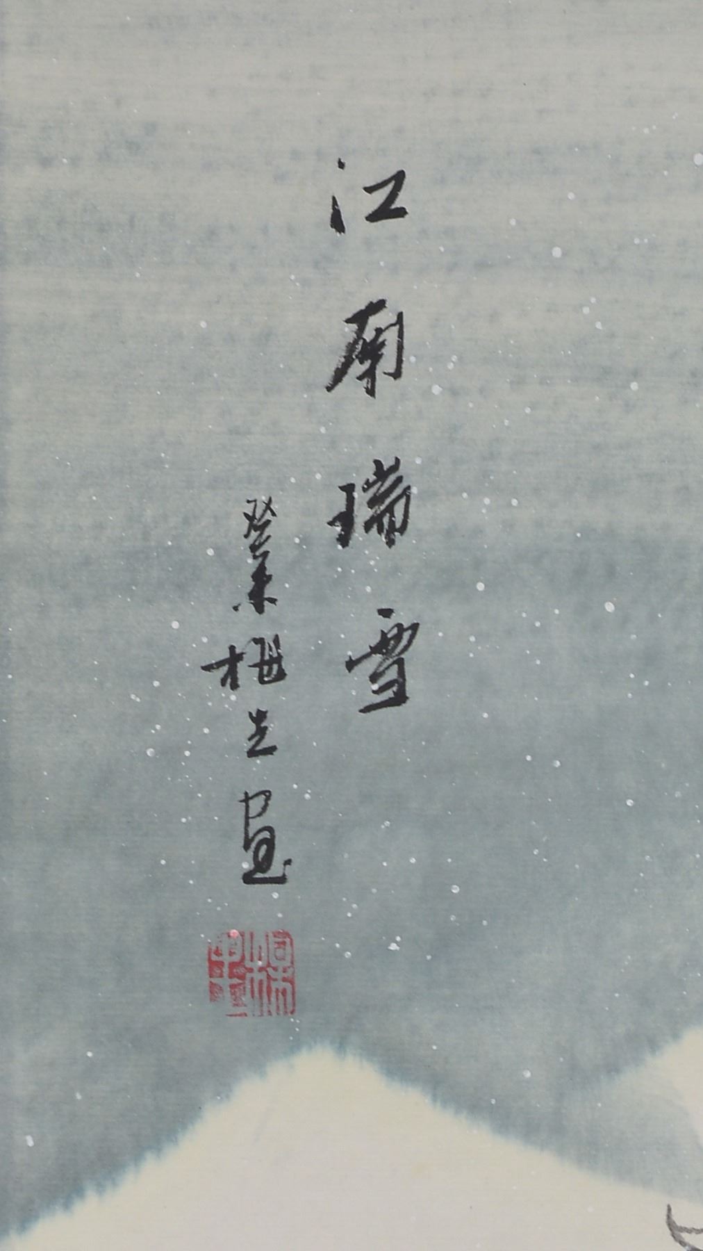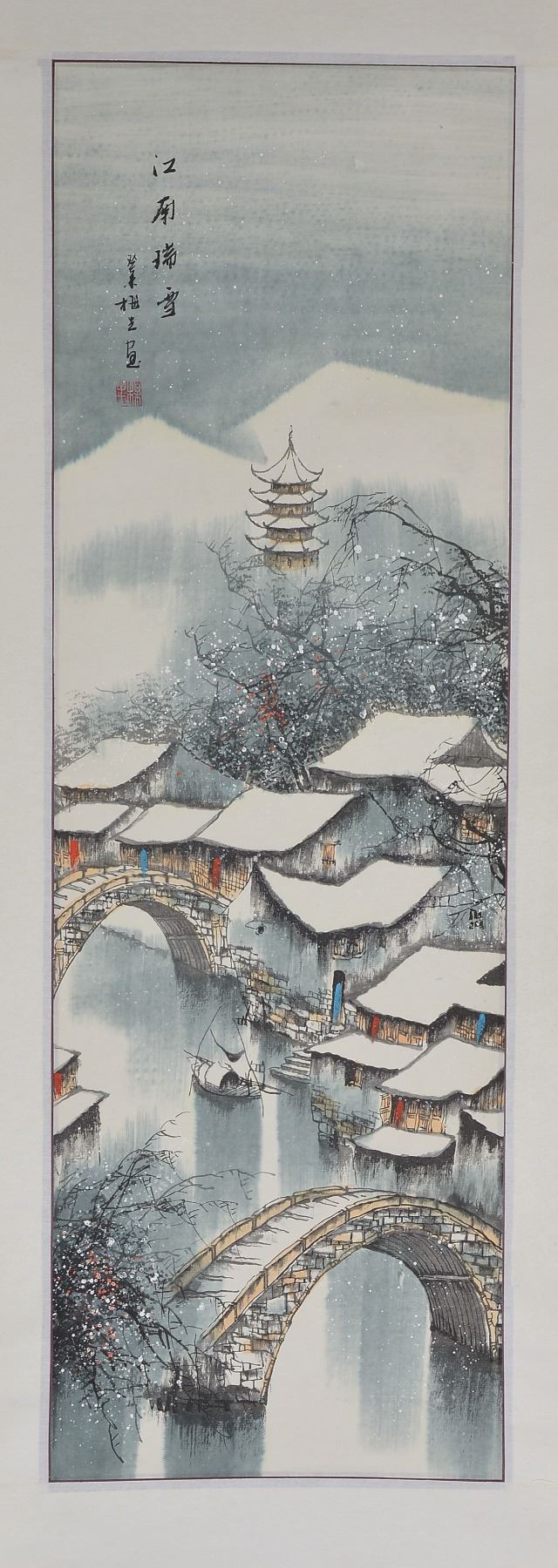 Ink and watercolor on paper, hanging scroll. Featuring village and boat scene in winter. Signed Mei Sheng, inscribed and signed with 1 artist seal. 87.5 x 28 cm
