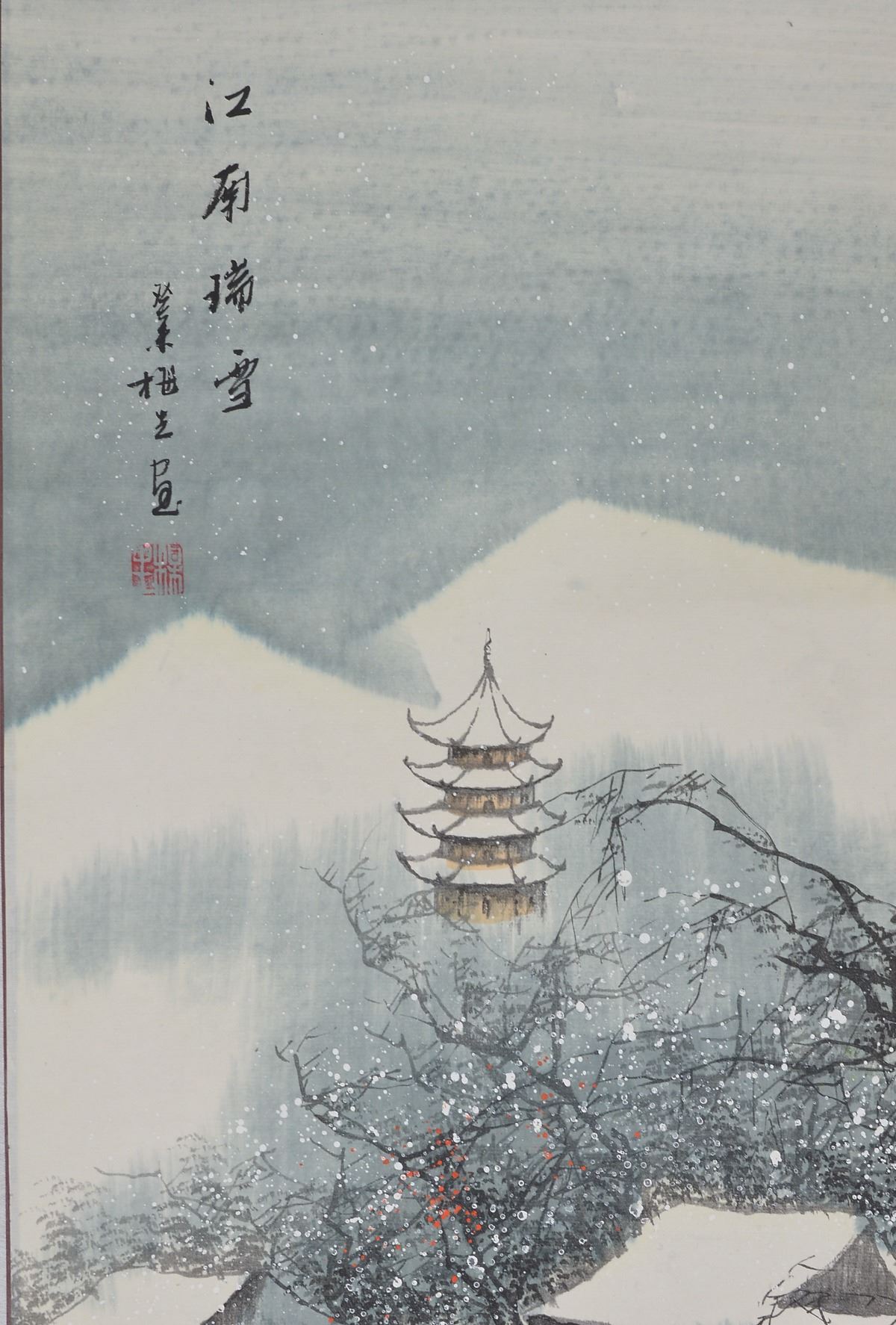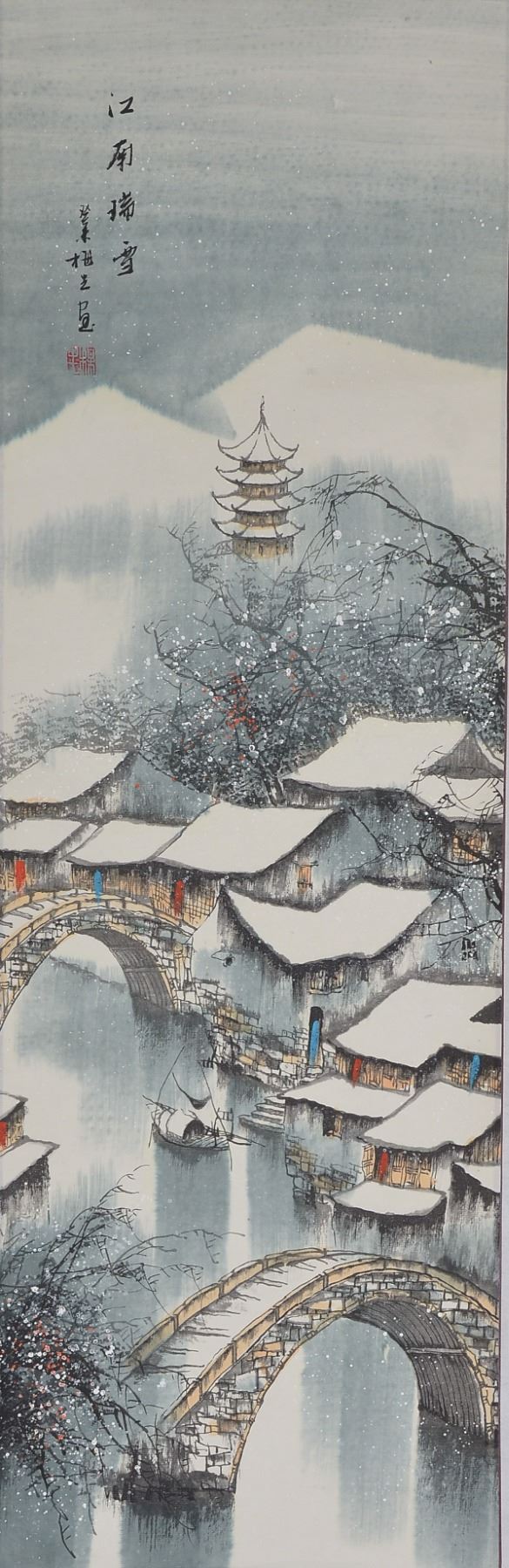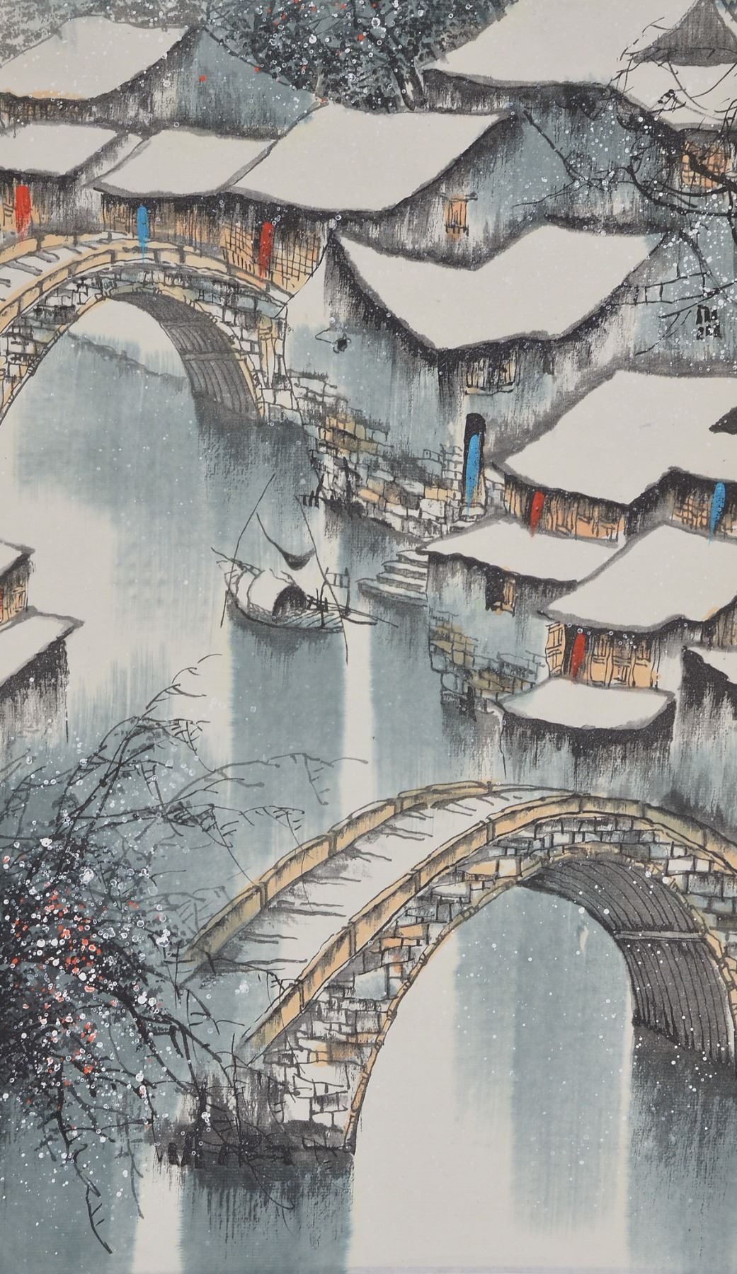 Ink and watercolor on paper, hanging scroll. Featuring village and boat scene in winter. Signed Mei Sheng, inscribed and signed with 1 artist seal. 87.5 x 28 cm