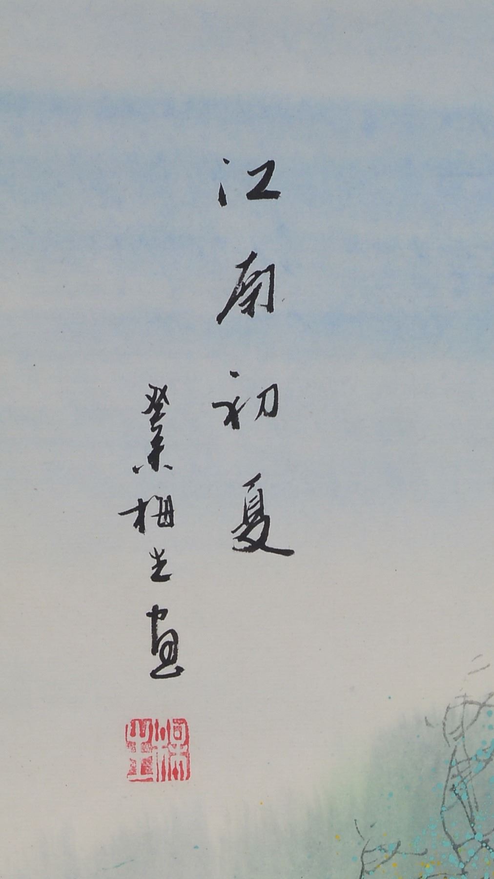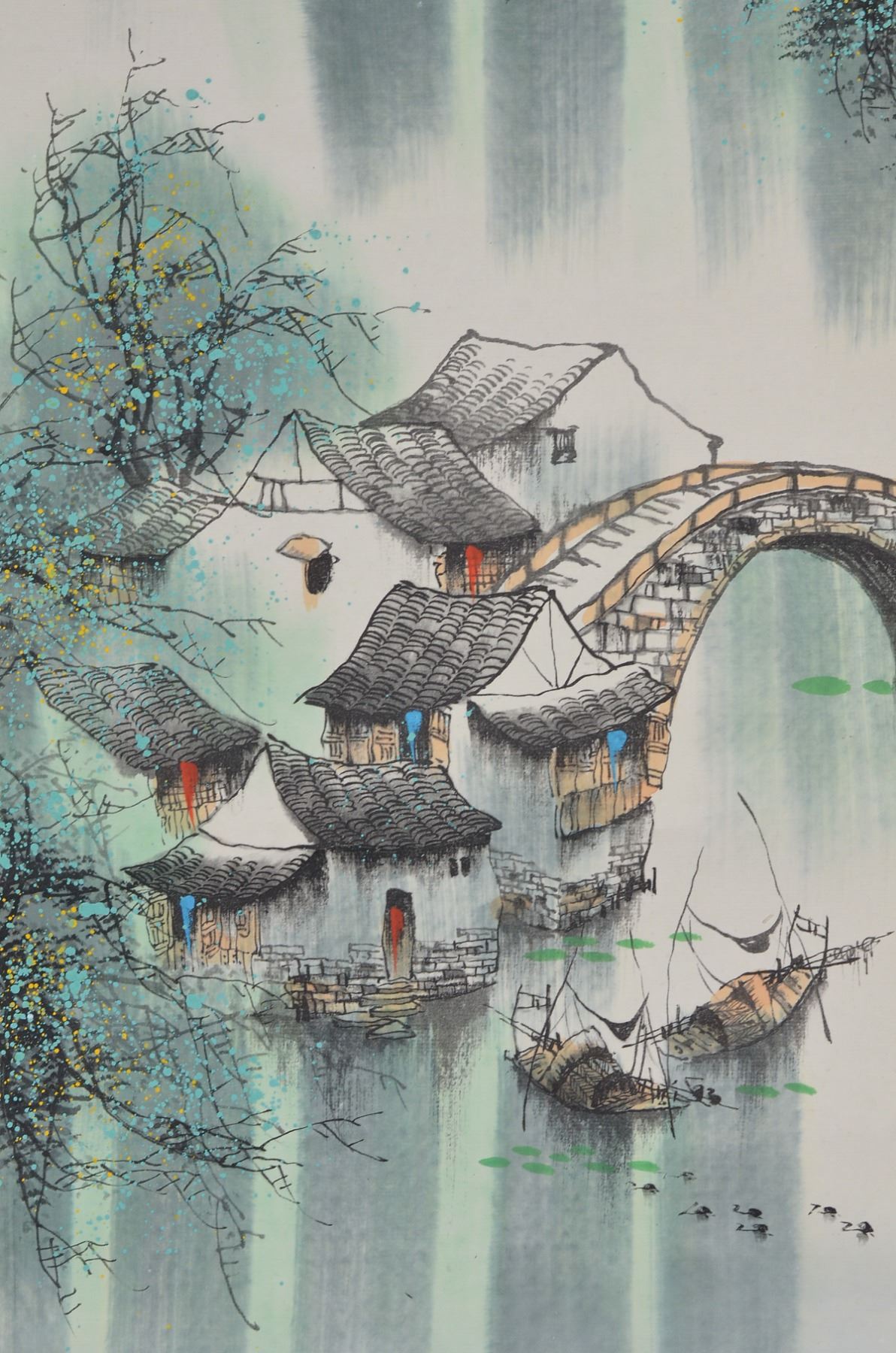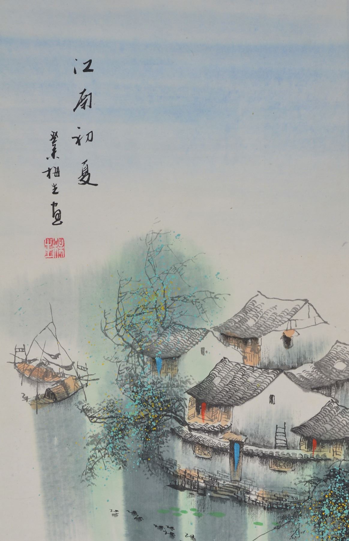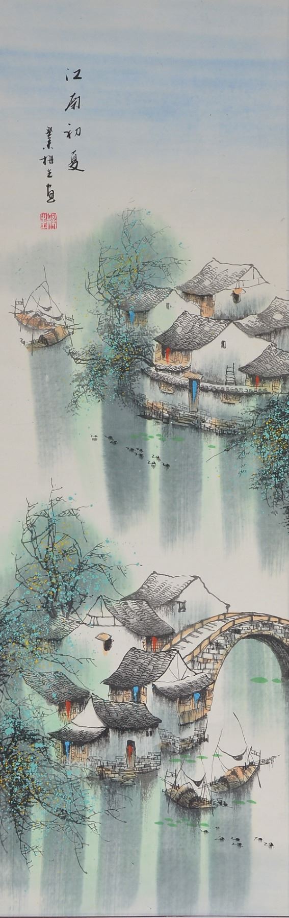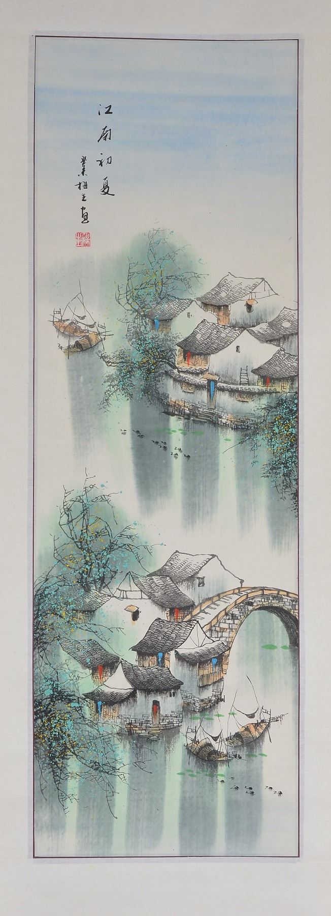 Ink and watercolor on paper, hanging scroll. Featuring village and boat scene in spring. Signed Mei Sun, and inscribed with one artist seal. 87.5 x 28 cm
