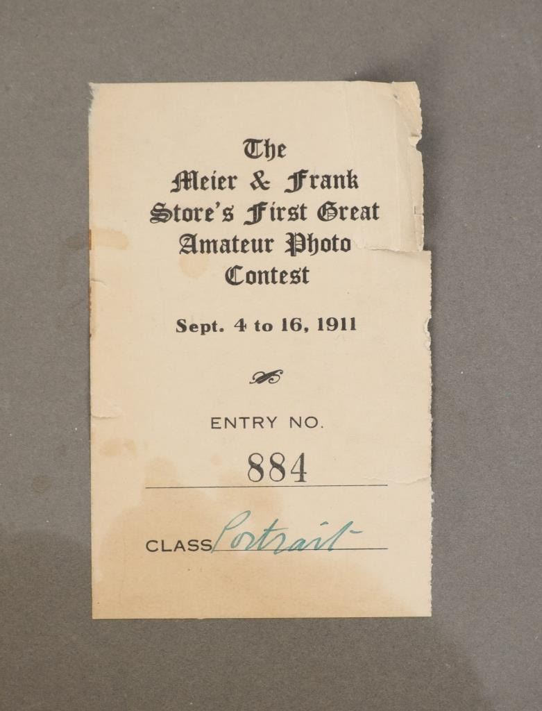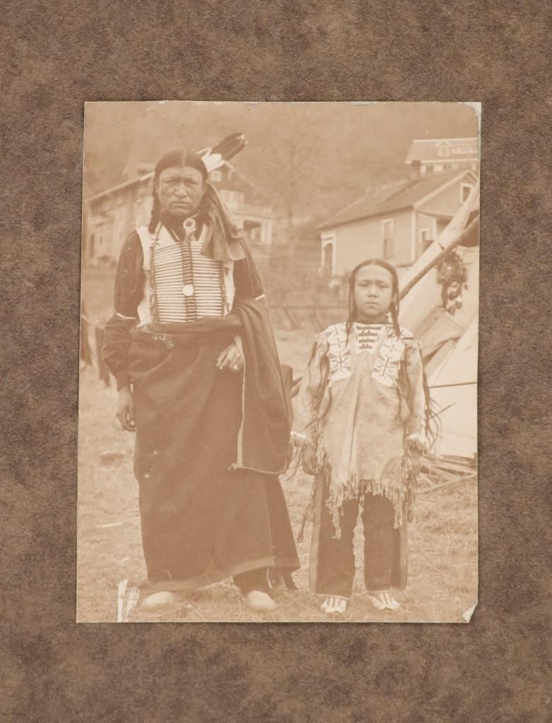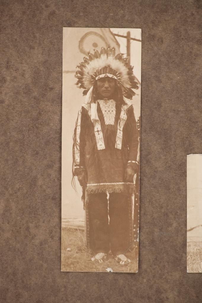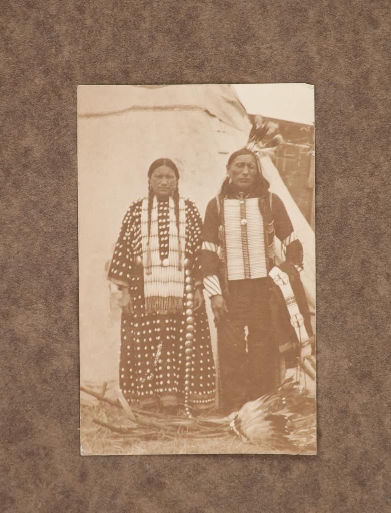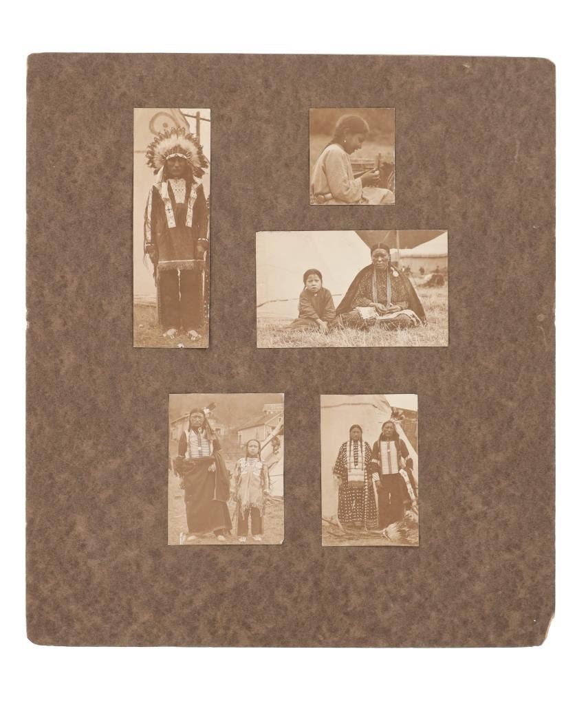 Featured in this lot are five original Native American photos set on a board. These photos were submitted to, "The Meier & Frank Store's First General Amateur Photo Contest" in 1911. No publisher mark is present. This board was entry number "884" and was in the "Portraits" class. It shows five photos of various Native American men, women and children posing for the photos. The top left photo shows a Native American man standing, looking directly at the viewer while he wears hide pants and shirt, moccasins and a large feather headdress. The top right photo shows a young Native American girl playing with a toy or making a small trinket. She is wearing her hair in a braid and smiles as she works. Below that photo, it shows a mother and daughter sitting near a teepee posing for the photo. They have their hair in braids and the mother appears to wearing a trade blanket and large beaded necklaces. The bottom left photo shows a Native American man and his son standing near a teepee, posing for the photo. They look directly at the viewer with stoic looks and adorned with beadwork and feathers. The man is wearing a beautiful bone hairpipe breastplate. The bottom right shows a similar image but features a man and woman, possibly husband and wife. They are standing near a teepee and are looking directly towards the viewer. The woman is wearing a large, beautiful concho belt and a hairpipe breastplate, while the man wears a hairpipe breastplate and feathers in his hair. Provenance: From the personal collection of Francoise Perriot (Françoise Perriot), noted historian author of the West and Native Americans. Perriot’s published works include such books as “Les Indiens et La Nature” (Indians and Nature) 2017, “La Conquête du Far West” (The Conquest of the Wild West) 2007, “Les Indiens d'Amérique du Nord” (North American Indians), “Guide Bleu : Etats-Unis Ouest Americain” (Blue Guide: United States West America). This piece and others come from her time collecting in Montana and the West, her book “Les Indiens et la nature” is one of the most notable in France documenting photographs of the west. The photos show good condition overall with slight wear present from their age and use over the years, but no signs of obvious damage is present. The photos measure from 2" L x 1 3/4" W to 4 15/16" L x 1 9/16" W. The board they are set on measures 12 1/4" L x 11" W.