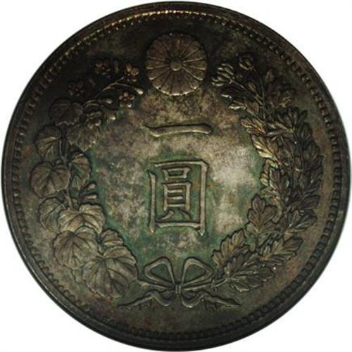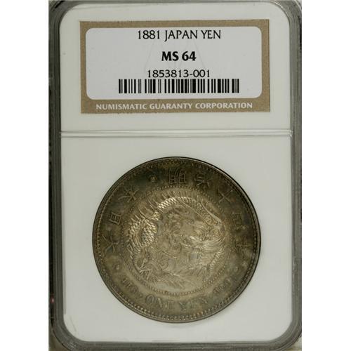 <B>Meiji 14 (1881) 1 Yen,</B></I> KM-YA25.2, MS64 NGC. Sharply struck and prooflike with gold, green, and brown toning. A very scarce issue in this condition.<BR><I>From the Shinholser Collection</B></I><BR><BR><b>Shipping:</b> Coin/Currency (<a target="_blank" href="http://www.heritageauctions.com/common/shipping.php">view shipping information</a>)