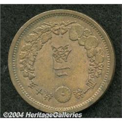 <B>Meiji 15 (1882) 2 Sen,</B></I> KM18, red and brown nearly UNC. <BR><BR><B>Important notice:</B> Heritage usually auctions material at the rate of 200-250 lots per hour. On some occasions eBay Live bid software or the Internet may not be able to keep up with the pace of the auction. We recommend placing a realistic absentee bid now as insurance to avoid disappointment. Occasionally the auctioneer may eliminate or reject an eBay Live bid, and the auctioneer may also reopen a lot after the close of the eBay live bidding (usually because we missed an audience bid), and may reject your bid even if it shows you as the winning bidder. By bidding via eBay Live, you agree that Heritage may award the lot to another bidder at its sole discretion under the circumstances described above or any other reasonable circumstances. Since eBay bids are not shown to us until we open the lot on the floor, we treat those bids just like floor bids. In most cases the floor responds before the eBay bid is presented to us, due to Internet lag time, so for consistency we have made it a policy that floor bids are always considered first over tie eBay live bids. Also please note that all Heritage lots purchased through eBay Live carry a 20% Buyer's Premium. Please make sure you read the Terms and Conditions before you bid.
