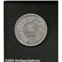 <B>Meiji 18 (1885) 1 Yen,</B></I> JNDA-1.10, KM-YA25.2, Choice AU/Unc, cleaned in the past with Proof appearing surfaces. This coin definitely has the appearance of a Proof, or Specimen, strike. We have never seen this date with surfaces quite like the ones on this piece. <BR><BR><B>Important notice:</B> Heritage usually auctions material at the rate of 200-250 lots per hour. On some occasions eBay Live bid software or the Internet may not be able to keep up with the pace of the auction. We recommend placing a realistic absentee bid now as insurance to avoid disappointment. Occasionally the auctioneer may eliminate or reject an eBay Live bid, and the auctioneer may also reopen a lot after the close of the eBay live bidding (usually because we missed an audience bid), and may reject your bid even if it shows you as the winning bidder. By bidding via eBay Live, you agree that Heritage may award the lot to another bidder at its sole discretion under the circumstances described above or any other reasonable circumstances. Since eBay bids are not shown to us until we open the lot on the floor, we treat those bids just like floor bids. In most cases the floor responds before the eBay bid is presented to us, due to Internet lag time, so for consistency we have made it a policy that floor bids are always considered first over tie eBay live bids. Also please note that all Heritage lots purchased through eBay Live carry a 20% Buyer's Premium. Please make sure you read the Terms and Conditions before you bid.