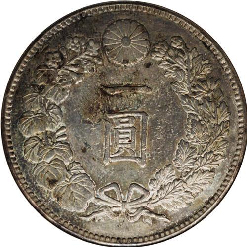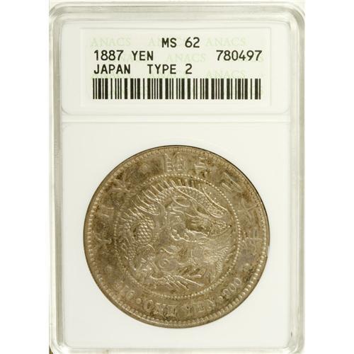<B>Meiji 20 (1887) 1 Yen, Type 2</B></I> KM-YA25.3, MS62 ANACS. Mottled blue and gray toning with several small marks on the reverse.<BR><BR><b>Shipping:</b> Coin/Currency (<a target="_blank" href="http://www.heritageauctions.com/common/shipping.php">view shipping information</a>)