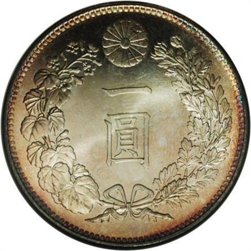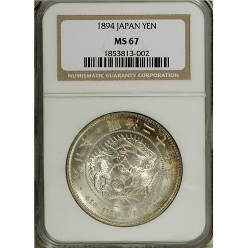 <B>Meiji 27 (1894) 1 Yen,</B></I> KM-YA25.3, MS67 NGC. Spectacular, mark-free satiny surfaces with scattered gold toning.<BR><I>From the Shinholser Collection</B></I><BR><BR><b>Shipping:</b> Coin/Currency (<a target="_blank" href="http://www.heritageauctions.com/common/shipping.php">view shipping information</a>)