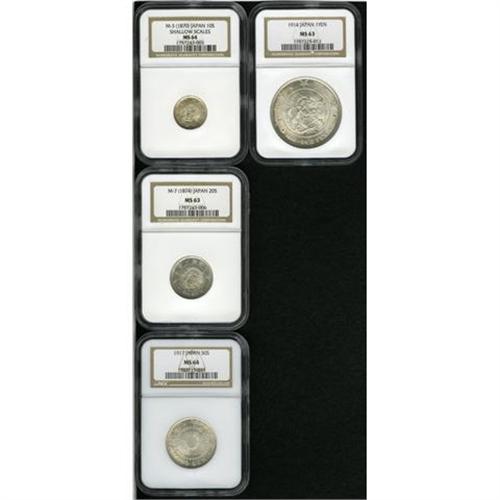 <B>An NGC certified lot as follows:</B></I> Meiji 3 (1870) 10 Sen, MS64 NGC; Meiji 7 (1874) 20 Sen, MS63 NGC; Taisho 6 (1917) 50 Sen, MS64 NGC; and a Taisho 3 (1914) 1 Yen, MS63 NGC.