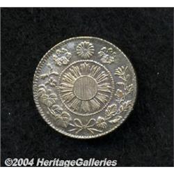 <B>Meiji 3 (1870) 5 Sen, Shallow Scales</B></I> JNDA-1.33, KM-Y1, lustrous AU with light hairlines. <BR><BR><B>Important notice:</B> Heritage usually auctions material at the rate of 200-250 lots per hour. On some occasions eBay Live bid software or the Internet may not be able to keep up with the pace of the auction. We recommend placing a realistic absentee bid now as insurance to avoid disappointment. Occasionally the auctioneer may eliminate or reject an eBay Live bid, and the auctioneer may also reopen a lot after the close of the eBay live bidding (usually because we missed an audience bid), and may reject your bid even if it shows you as the winning bidder. By bidding via eBay Live, you agree that Heritage may award the lot to another bidder at its sole discretion under the circumstances described above or any other reasonable circumstances. Since eBay bids are not shown to us until we open the lot on the floor, we treat those bids just like floor bids. In most cases the floor responds before the eBay bid is presented to us, due to Internet lag time, so for consistency we have made it a policy that floor bids are always considered first over tie eBay live bids. Also please note that all Heritage lots purchased through eBay Live carry a 20% Buyer's Premium. Please make sure you read the Terms and Conditions before you bid.