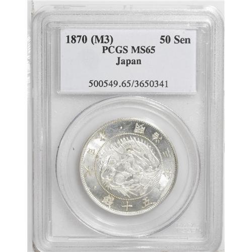 <B>Meiji 3 (1870) 50 Sen,</B></I> KM-Y4, MS65 PCGS. Brilliant white with gleaming mint frost. Reflective surfaces and only a few minor contact marks.<BR><BR><b>Shipping:</b> Coin/Currency (<a target="_blank" href="http://www.heritageauctions.com/common/shipping.php">view shipping information</a>)