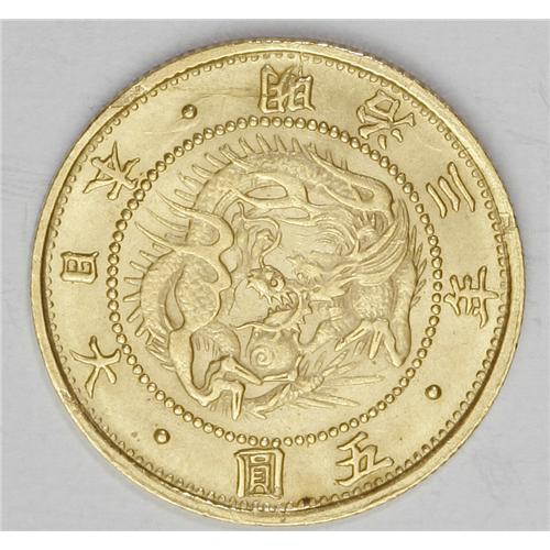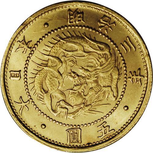 <B>Meiji 3 (1870) gold 5 Yen,</B></I> F-47, KM-Y11, lustrous UNC with minor edge flaws. The first-year issue of the first gold 5 Yen type.<BR><BR><b>Shipping:</b> Coin/Currency (<a target="_blank" href="http://www.heritageauctions.com/common/shipping.php">view shipping information</a>)