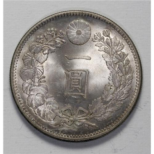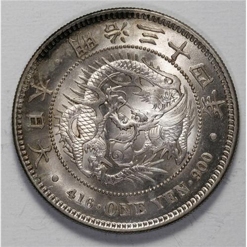 <B>Meiji 34 (1901) 1 Yen,</B></I> KM-YA25.3, Choice UNC. Satiny, near-flawless, surfaces with light gray toning and a thin band of darker charcoal around part of the obverse rim.<BR><I>From the Monedas Oro Collection</B></I><BR><BR><b>Shipping:</b> Coin/Currency (<a target="_blank" href="http://www.heritageauctions.com/common/shipping.php">view shipping information</a>)