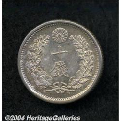 <B>Meiji 34 (1901) 10 Sen,</B></I> JNDA-1.24, KM-Y23, Choice Unc. with lovely toning and minor reverse contact marks. Very scarce. <BR><BR><B>Important notice:</B> Heritage usually auctions material at the rate of 200-250 lots per hour. On some occasions eBay Live bid software or the Internet may not be able to keep up with the pace of the auction. We recommend placing a realistic absentee bid now as insurance to avoid disappointment. Occasionally the auctioneer may eliminate or reject an eBay Live bid, and the auctioneer may also reopen a lot after the close of the eBay live bidding (usually because we missed an audience bid), and may reject your bid even if it shows you as the winning bidder. By bidding via eBay Live, you agree that Heritage may award the lot to another bidder at its sole discretion under the circumstances described above or any other reasonable circumstances. Since eBay bids are not shown to us until we open the lot on the floor, we treat those bids just like floor bids. In most cases the floor responds before the eBay bid is presented to us, due to Internet lag time, so for consistency we have made it a policy that floor bids are always considered first over tie eBay live bids. Also please note that all Heritage lots purchased through eBay Live carry a 20% Buyer's Premium. Please make sure you read the Terms and Conditions before you bid.