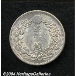 <B>Meiji 34 (1901) 50 Sen,</B></I> JNDA-1.14, KM-Y25, lightly toned Unc. <BR><BR><B>Important notice:</B> Heritage usually auctions material at the rate of 200-250 lots per hour. On some occasions eBay Live bid software or the Internet may not be able to keep up with the pace of the auction. We recommend placing a realistic absentee bid now as insurance to avoid disappointment. Occasionally the auctioneer may eliminate or reject an eBay Live bid, and the auctioneer may also reopen a lot after the close of the eBay live bidding (usually because we missed an audience bid), and may reject your bid even if it shows you as the winning bidder. By bidding via eBay Live, you agree that Heritage may award the lot to another bidder at its sole discretion under the circumstances described above or any other reasonable circumstances. Since eBay bids are not shown to us until we open the lot on the floor, we treat those bids just like floor bids. In most cases the floor responds before the eBay bid is presented to us, due to Internet lag time, so for consistency we have made it a policy that floor bids are always considered first over tie eBay live bids. Also please note that all Heritage lots purchased through eBay Live carry a 20% Buyer's Premium. Please make sure you read the Terms and Conditions before you bid.