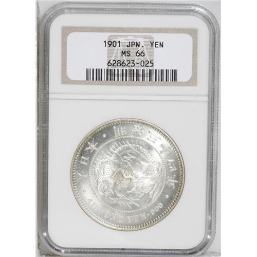 <B>Meiji 34 (1901),</B></I> Y-A25.3, MS66 NGC. Shimmering luster with a full strike, near mark-free surfaces, and a hint of golden toning.