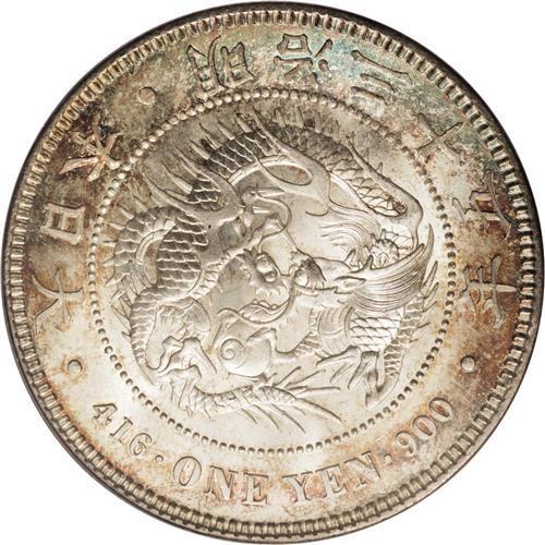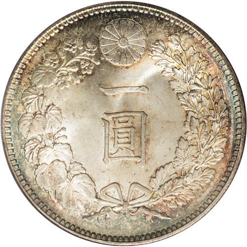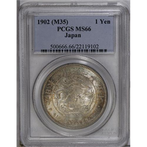 <B>Meiji 35 (1902) 1 Yen,</B></I> KM-YA25.3, MS66 PCGS. Appealing gold and sea-green toning with steel-blue highlights. The strike is bold and the surfaces pristine.<BR><BR><b>Shipping:</b> Coin/Currency (<a target="_blank" href="http://www.heritageauctions.com/common/shipping.php">view shipping information</a>)