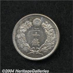 <B>Meiji 39 (1906) 20 Sen,</B></I> JNDA-1.22, KM-Y30, fully lustrous Unc. with light toning and minor reverse hairlines. <BR><BR><B>Important notice:</B> Heritage usually auctions material at the rate of 200-250 lots per hour. On some occasions eBay Live bid software or the Internet may not be able to keep up with the pace of the auction. We recommend placing a realistic absentee bid now as insurance to avoid disappointment. Occasionally the auctioneer may eliminate or reject an eBay Live bid, and the auctioneer may also reopen a lot after the close of the eBay live bidding (usually because we missed an audience bid), and may reject your bid even if it shows you as the winning bidder. By bidding via eBay Live, you agree that Heritage may award the lot to another bidder at its sole discretion under the circumstances described above or any other reasonable circumstances. Since eBay bids are not shown to us until we open the lot on the floor, we treat those bids just like floor bids. In most cases the floor responds before the eBay bid is presented to us, due to Internet lag time, so for consistency we have made it a policy that floor bids are always considered first over tie eBay live bids. Also please note that all Heritage lots purchased through eBay Live carry a 20% Buyer's Premium. Please make sure you read the Terms and Conditions before you bid.