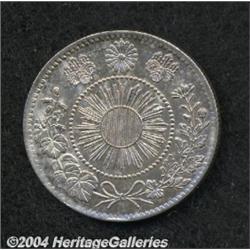 <B>Meiji 4 (1871) 20 Sen,</B></I> JNDA-1.20, KM-Y3, lightly toned Unc. <BR><BR><B>Important notice:</B> Heritage usually auctions material at the rate of 200-250 lots per hour. On some occasions eBay Live bid software or the Internet may not be able to keep up with the pace of the auction. We recommend placing a realistic absentee bid now as insurance to avoid disappointment. Occasionally the auctioneer may eliminate or reject an eBay Live bid, and the auctioneer may also reopen a lot after the close of the eBay live bidding (usually because we missed an audience bid), and may reject your bid even if it shows you as the winning bidder. By bidding via eBay Live, you agree that Heritage may award the lot to another bidder at its sole discretion under the circumstances described above or any other reasonable circumstances. Since eBay bids are not shown to us until we open the lot on the floor, we treat those bids just like floor bids. In most cases the floor responds before the eBay bid is presented to us, due to Internet lag time, so for consistency we have made it a policy that floor bids are always considered first over tie eBay live bids. Also please note that all Heritage lots purchased through eBay Live carry a 20% Buyer's Premium. Please make sure you read the Terms and Conditions before you bid.