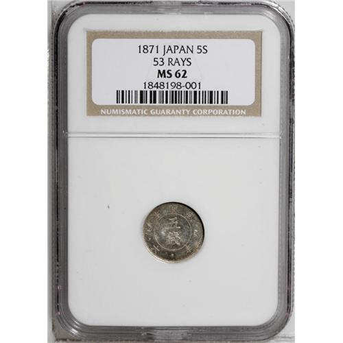 <B>Meiji 4 (1871) 5 Sen 53 Rays,</B></I> KM-Y6.2, MS62 NGC. Lustrous with greenish-gray toning.
