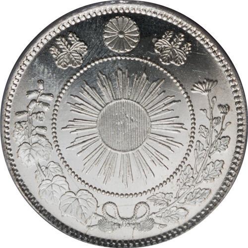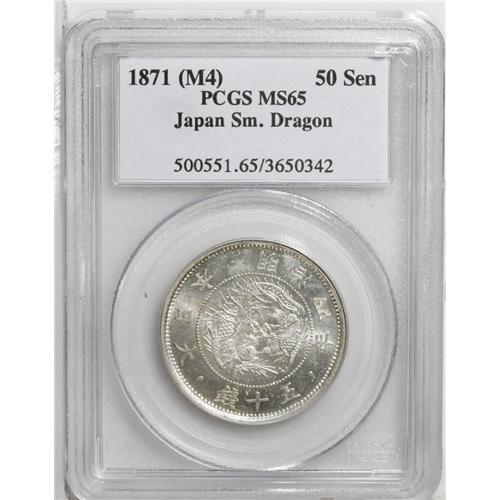 <B>Meiji 4 (1871) 50 Sen,</B></I> KM-Y4a.1, MS65 PCGS. Superbly struck with prooflike surfaces and only a few miniscule contact marks. A splendid example with stunning eye-appeal.<BR><BR><b>Shipping:</b> Coin/Currency (<a target="_blank" href="http://www.heritageauctions.com/common/shipping.php">view shipping information</a>)