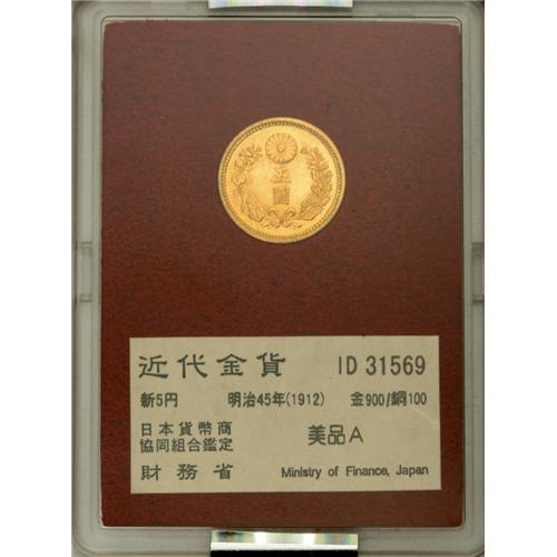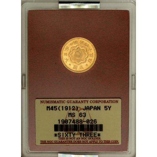 <B>Meiji 45 (1912) gold 5 Yen,</B></I> F-52, KM-Y32, MS63 NGC. Brilliant and well struck with light reverse contact marks.<BR><BR><b>Shipping:</b> Coin/Currency (<a target="_blank" href="http://www.heritageauctions.com/common/shipping.php">view shipping information</a>)