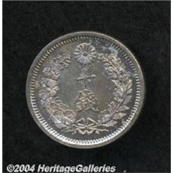 <B>Meiji 7 (1874) 10 Sen,</B></I> JNDA-1.24, KM-Y23, beautifully toned, prooflike Gem BU. A very scarce date, and the finest example that we have seen. <BR><BR><B>Important notice:</B> Heritage usually auctions material at the rate of 200-250 lots per hour. On some occasions eBay Live bid software or the Internet may not be able to keep up with the pace of the auction. We recommend placing a realistic absentee bid now as insurance to avoid disappointment. Occasionally the auctioneer may eliminate or reject an eBay Live bid, and the auctioneer may also reopen a lot after the close of the eBay live bidding (usually because we missed an audience bid), and may reject your bid even if it shows you as the winning bidder. By bidding via eBay Live, you agree that Heritage may award the lot to another bidder at its sole discretion under the circumstances described above or any other reasonable circumstances. Since eBay bids are not shown to us until we open the lot on the floor, we treat those bids just like floor bids. In most cases the floor responds before the eBay bid is presented to us, due to Internet lag time, so for consistency we have made it a policy that floor bids are always considered first over tie eBay live bids. Also please note that all Heritage lots purchased through eBay Live carry a 20% Buyer's Premium. Please make sure you read the Terms and Conditions before you bid.