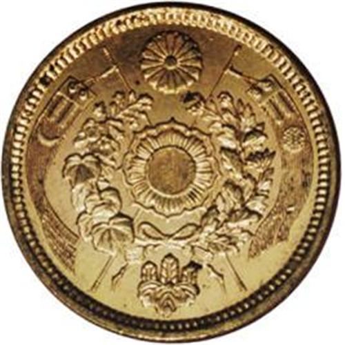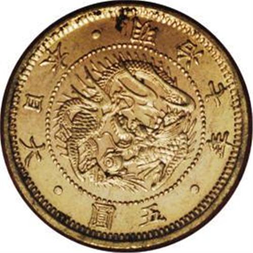 <B>Meiji 7 (1874) gold 5 Yen,</B></I> F-47, KM-Y11a, MS62 NGC. Boldly struck with prooflike surfaces and scattered bits of the dirt-like residue as seen on a few of the government pieces. A very scarce issue.<BR><BR><b>Shipping:</b> Coin/Currency (<a target="_blank" href="http://www.heritageauctions.com/common/shipping.php">view shipping information</a>)