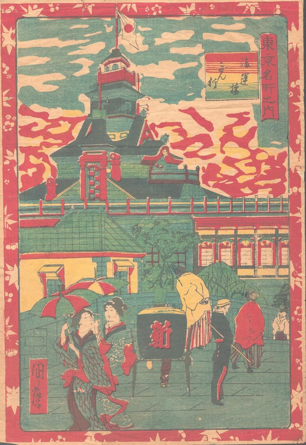 Meiji Era Artist - "Gathering Outside Temple" Japanese Woodblock Print, some aging, otherwise fine condition, 14 x 10