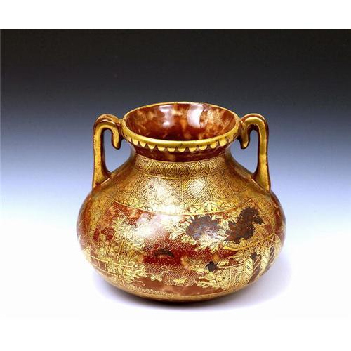 Meiji (1868-1912) Japanese Kinkozan Satsuma 2 ears Vase with Amber Coloring & Mable Coloring Signed