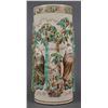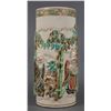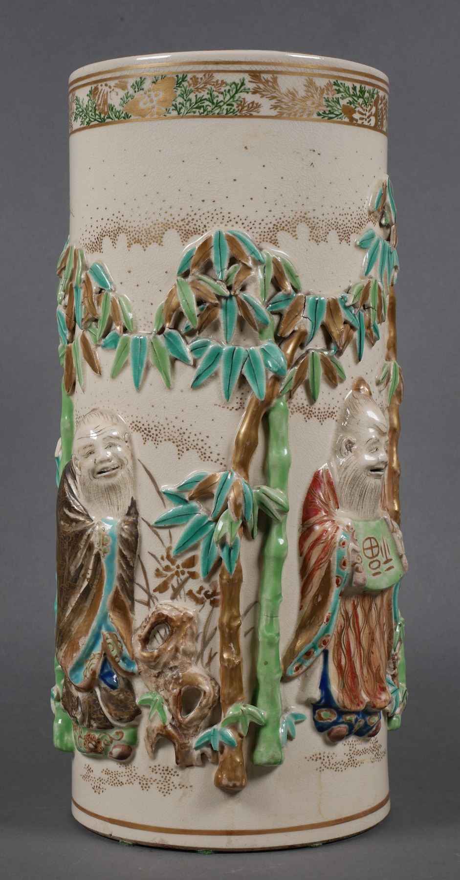 Antique Japanese vase, marked (in part) "Kyoto, Japan" -- maker unidentified. Measures 11-7/8" high, in fine condition, with some gilt wear around rim. Four figures framed in bamboo, all in high relief.