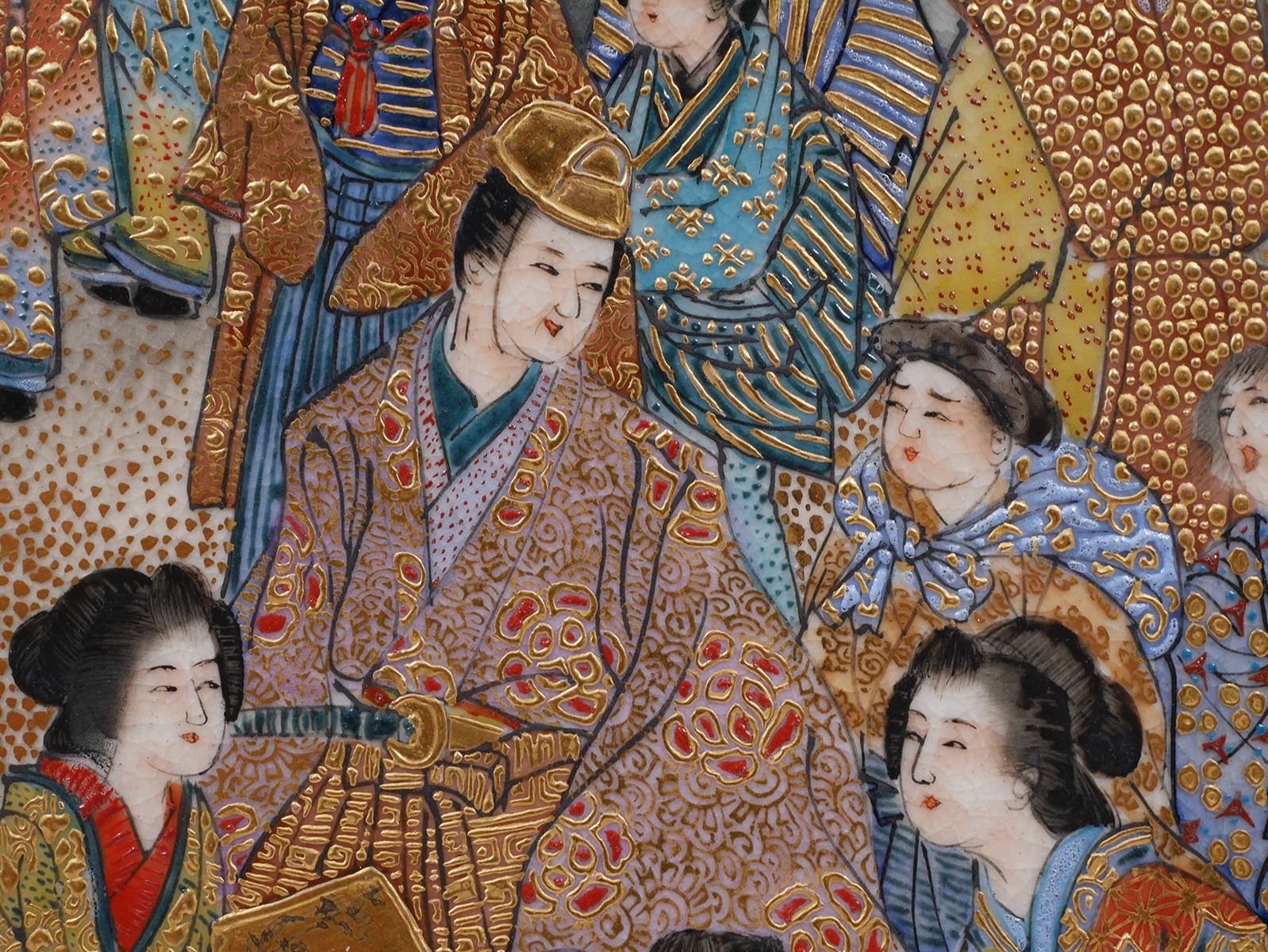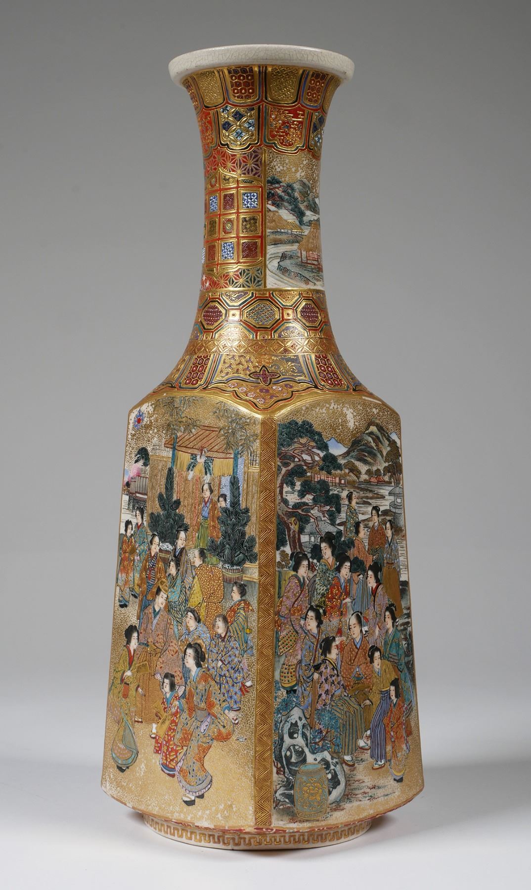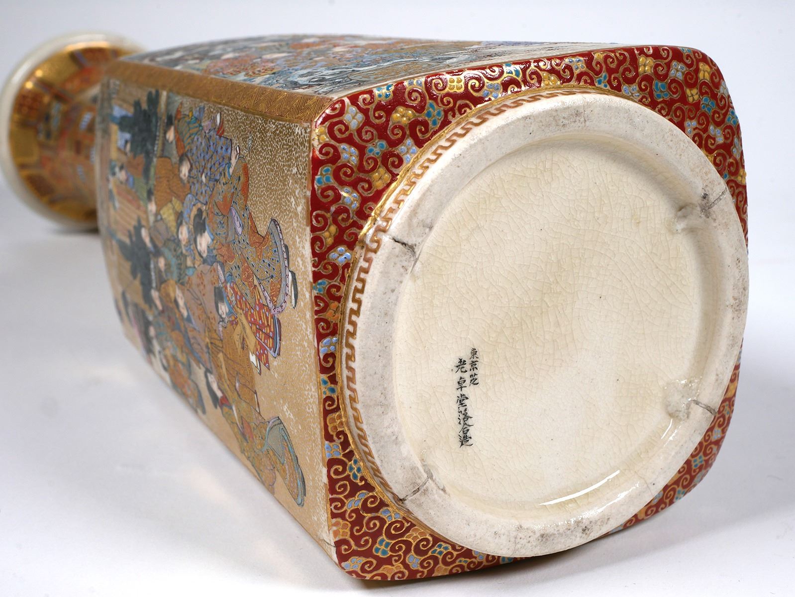 Stately 19C Japanese Satsuma vase, signed on bottom -- Shiba Tokyo etc. Incredible detail. Measures 12-1/8" high, in very fine, undamaged condition. Some minor gilt wear. From estate collection of very fine Satsuma, several pieces of which are in today's sale.