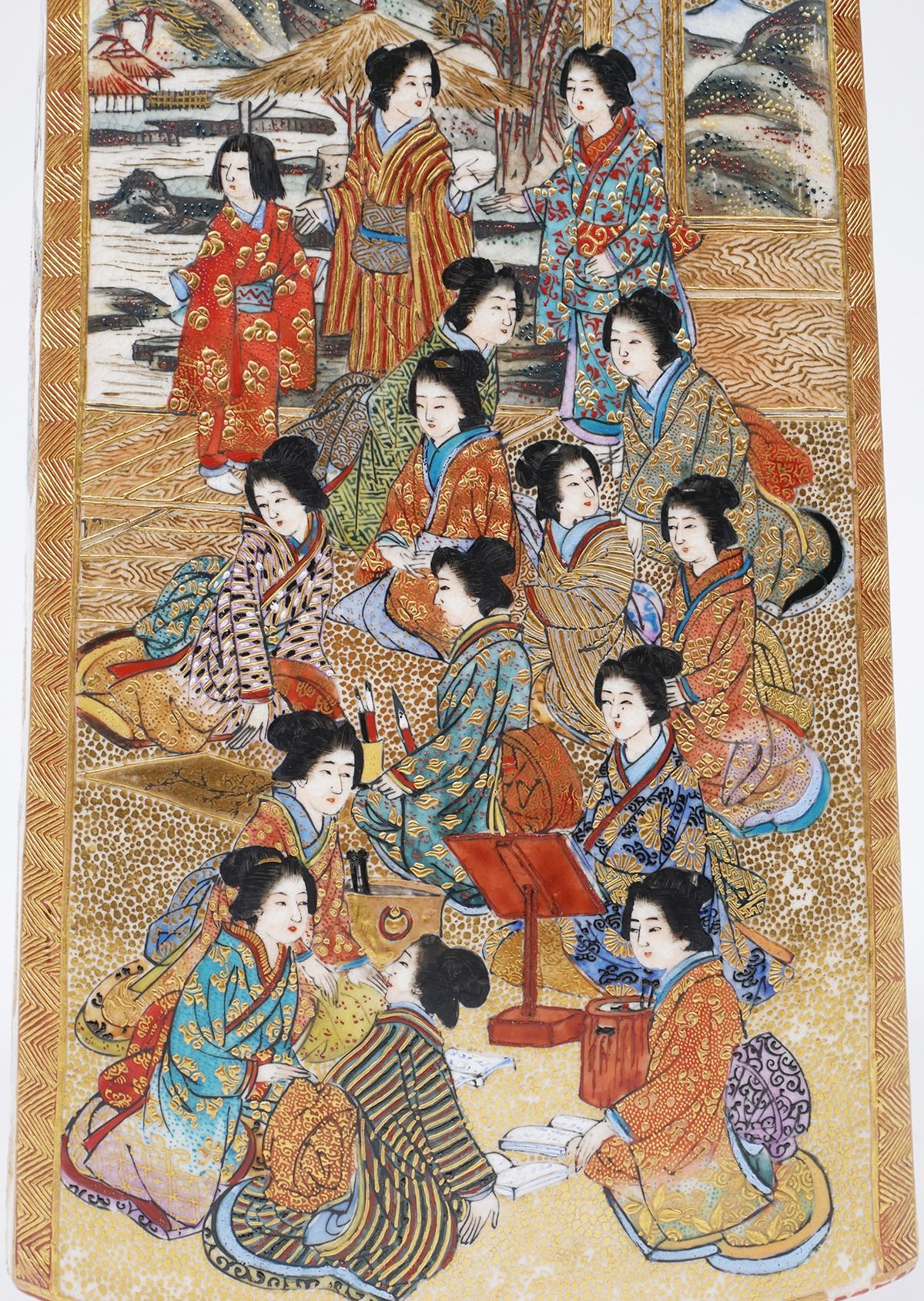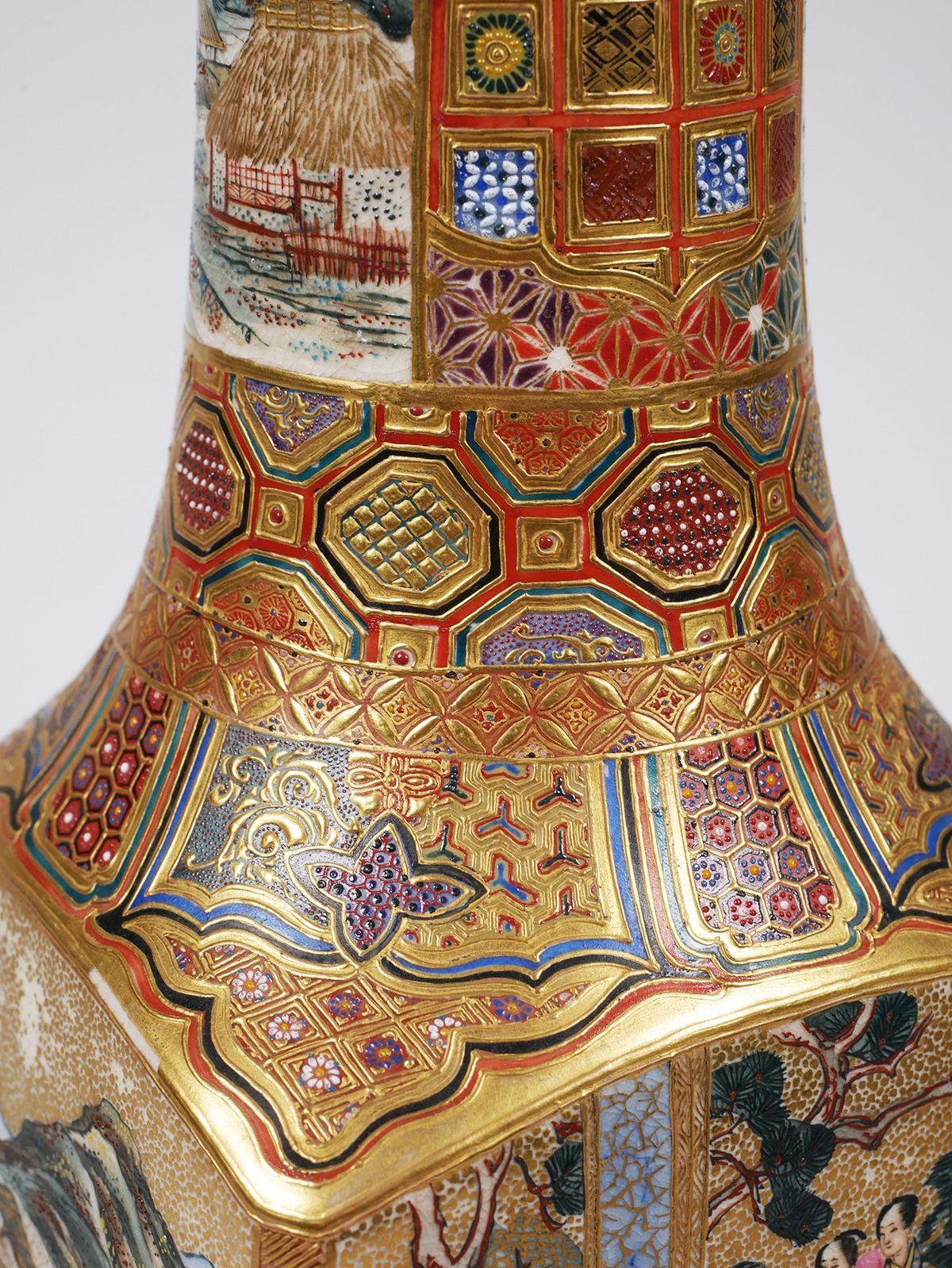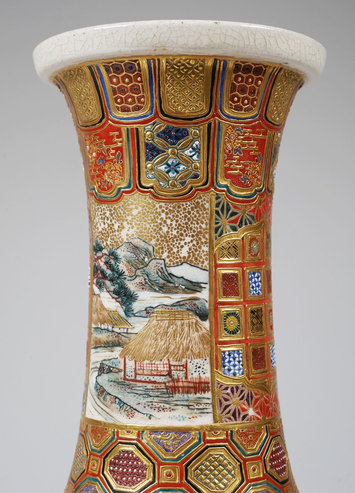 Stately 19C Japanese Satsuma vase, signed on bottom -- Shiba Tokyo etc. Incredible detail. Measures 12-1/8" high, in very fine, undamaged condition. Some minor gilt wear. From estate collection of very fine Satsuma, several pieces of which are in today's sale.