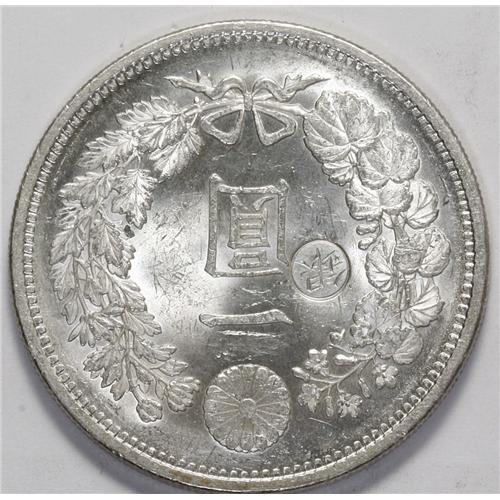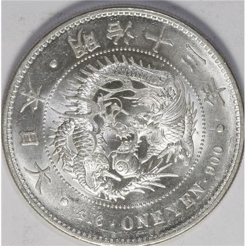 <B>Meiji13 (1880) 1 Yen Gin left,</B></I> the Krause section on Gin marks is totally confusing, therefore all I will say is I think it should be KM-Y28a.4, this piece is brilliant white UNC with a few minor reverse marks. Needless to say, I have never seen many Meiji 13 pieces this nice, much less one with a Gin mark.