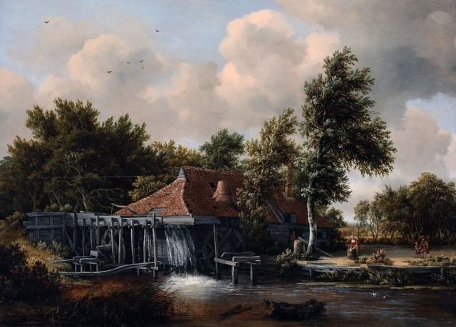 Artist: Meindert Hobbema - Title: A Watermill - Medium: Fine Art Reproduction Giclee on Canvas - Image Size: Approximately 23 inches x 32 inches - Unframed on Unstretched Canvas - Biography: Hobbema is the only known pupil of Jacob van Ruisdael. Less dramatic than Ruisdael's compositions, Hobbema's are lighter and more cheerful. He produced over thirty views of watermills, all based on drawings done in the eastern part of Holland. He used the motif of this mill several times, with its downward rush of water highlighted by rays of sun. A. van der Hoop Bequest, 1854. On loan from the City of Amsterdam, 1885.