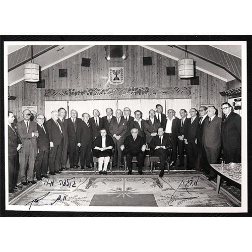 <Our item number 141113><B>Meir, Begin, and Dayan Signed Photograph.</B> Black and white photograph of a group of 23 Israeli officials, signed in Hebrew by Golda Meir, Moshe Dayan, and Menachem Begin, 5x7 in., n.p., n.d. Fine. <BR>Estimated Value $300 - 400. <BR><BR>Our item number 141113<BR><IMAGES><P ALIGN="CENTER"><IMG SRC="http://www.goldbergcoins.net/liveauction/49jpegs/141113.jpg"> </P></IMAGES>