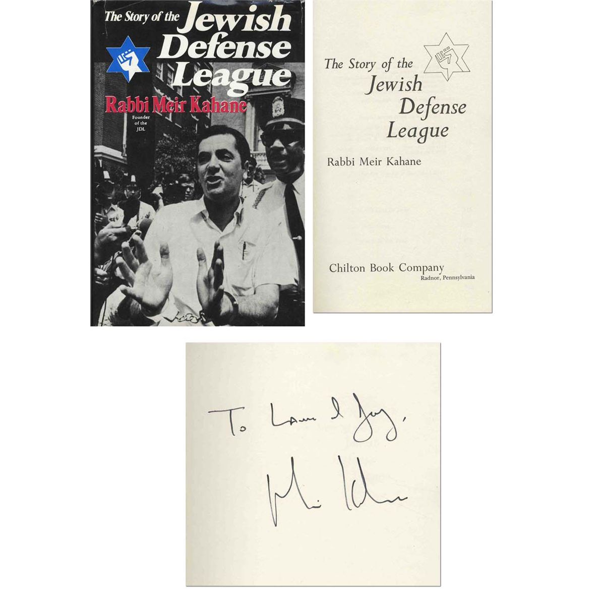 Rare first edition, signed copy of Rabbi Meir Kahane's book, ''The Story of the Jewish Defense League.'' Published by the Chilton Book Co: Radnor, PA: 1975. Inscribed on the front free endpaper, ''To Laura al Jay, Meir Kahane''. Here, Rabbi Kahane, founder of the Jewish Defense League and one-time member of the Knesset, defends the actions of his controversial organization and explains the biblical and social reasoning underpinning it. Unclipped dustjacket is in good condition with a few small tears. Book itself in near fine condition.