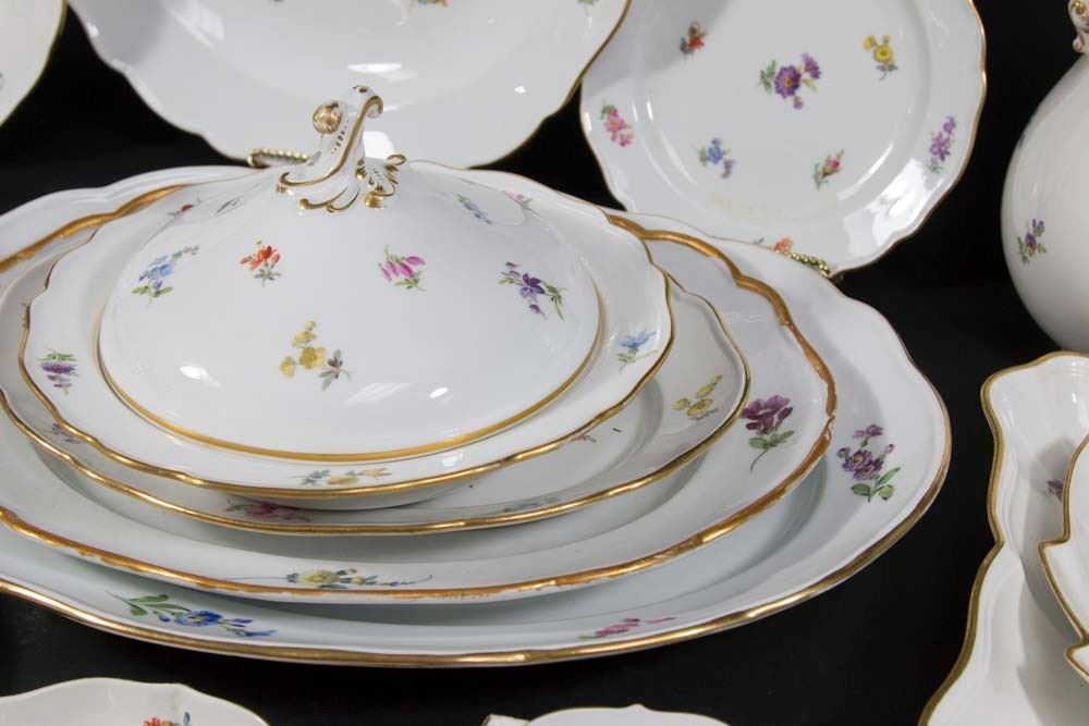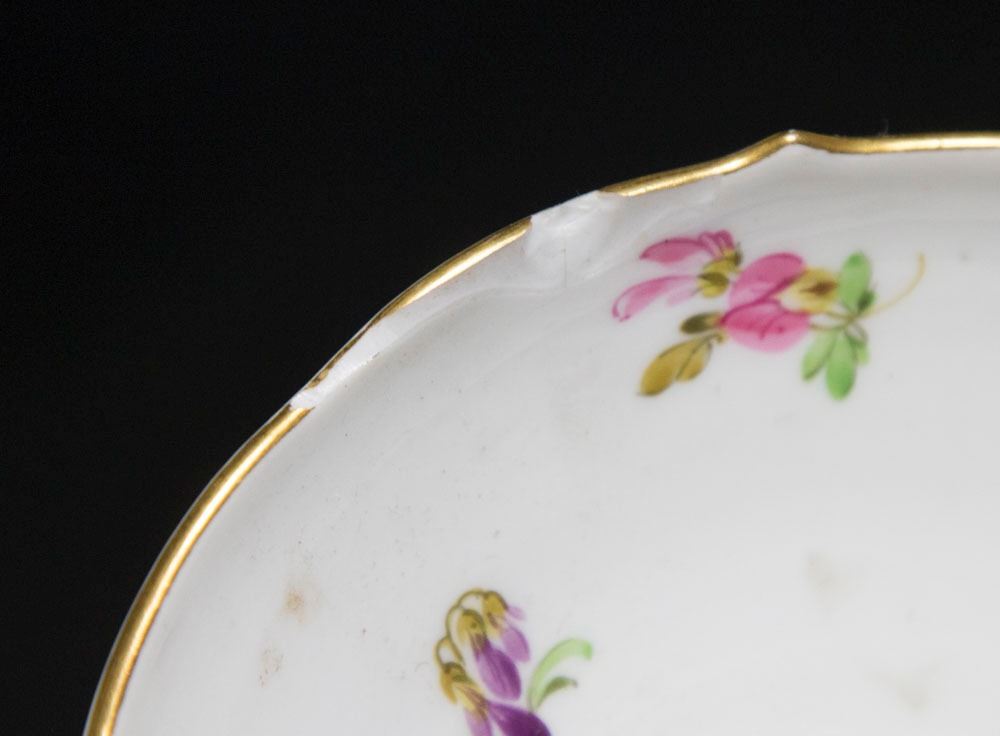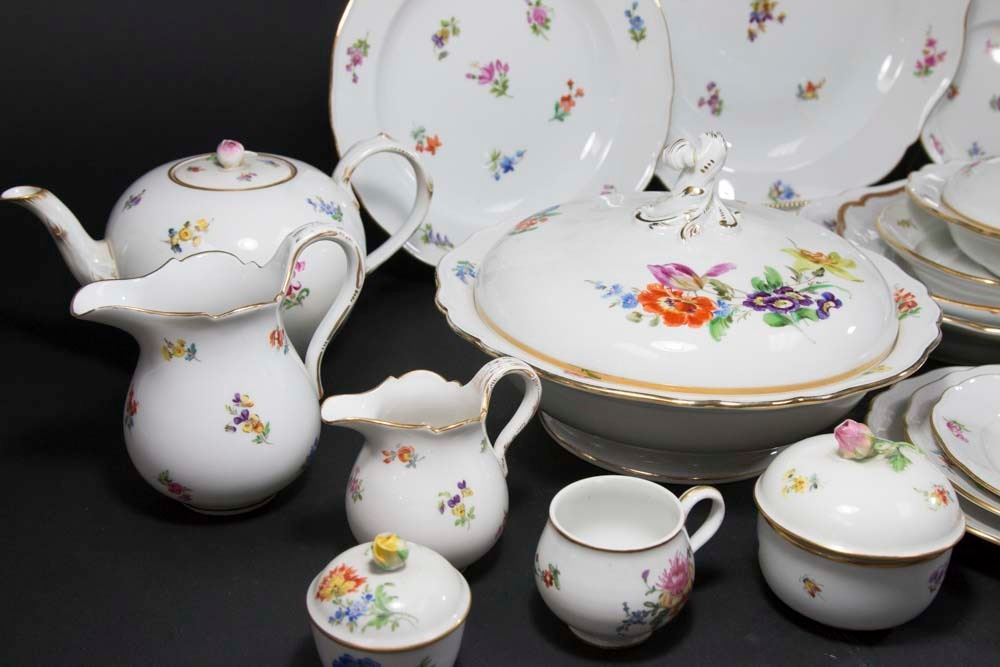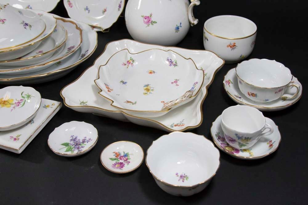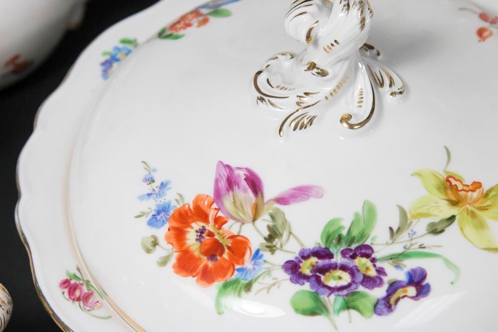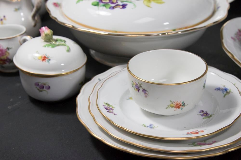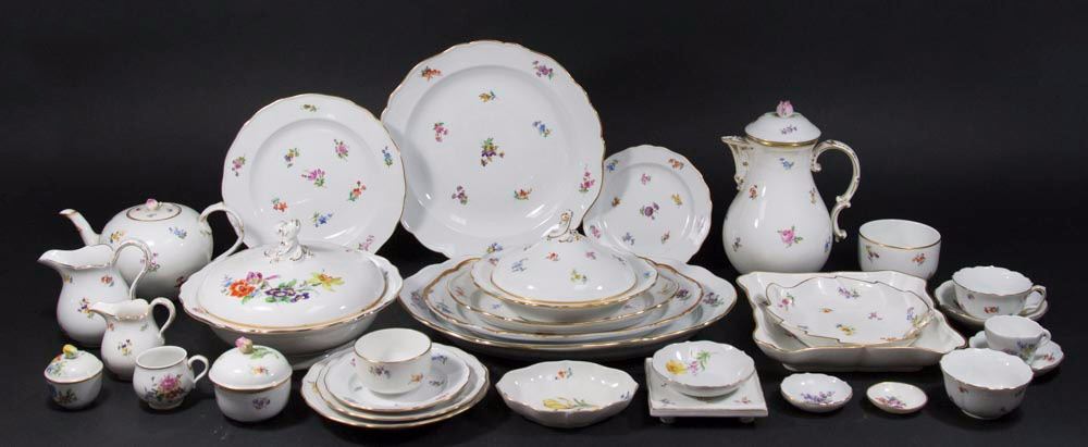 3 Covered Tureens, largest is 6" x 10 1/2", 1 Teapot 10"H, 1 Coffeepot 6"H, 1 Square plate footed 5" Sq, 3 creamers, 5"H tallest, 3 Oval trays (Middle has repairs to edge. Largest is 16"W x 12 1/2"D, 1 Square Platter 9 1/2"D., 6 nut dishes 3"D, 1 nut dish 2 1/2"D, 10, 9 1/2" plates, 14-7" plates (repair on edge of one), 1 leaf dish 8 1/2" x 7 1/4", 8 teacups with loop handles-2 1/2"H, 14 demitasse cups with loop handles, 9 tea cus, 9 tea cups with wider mouth, 6 plates 5 1/8", 12 saucers-6"D, 1 covered honey jar-3 1/2"H, 4 plates 5 1/4", 5-6 1/4" plates floral-brown rim, 4-5" berry bowls floral, 1-5 3/4" ice cream bowl, 5-4 1/4" dish, 2-4" dish, 2-6 5/8 floral dessert plates, 6 odd small dishes, 3 odd small bowls, 2 cups and saucers, covered cup and mint dish. From a royal Austro-Hungarian family dating back centuries. (6173) Chip on saucer.