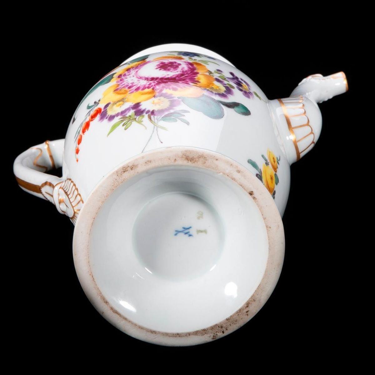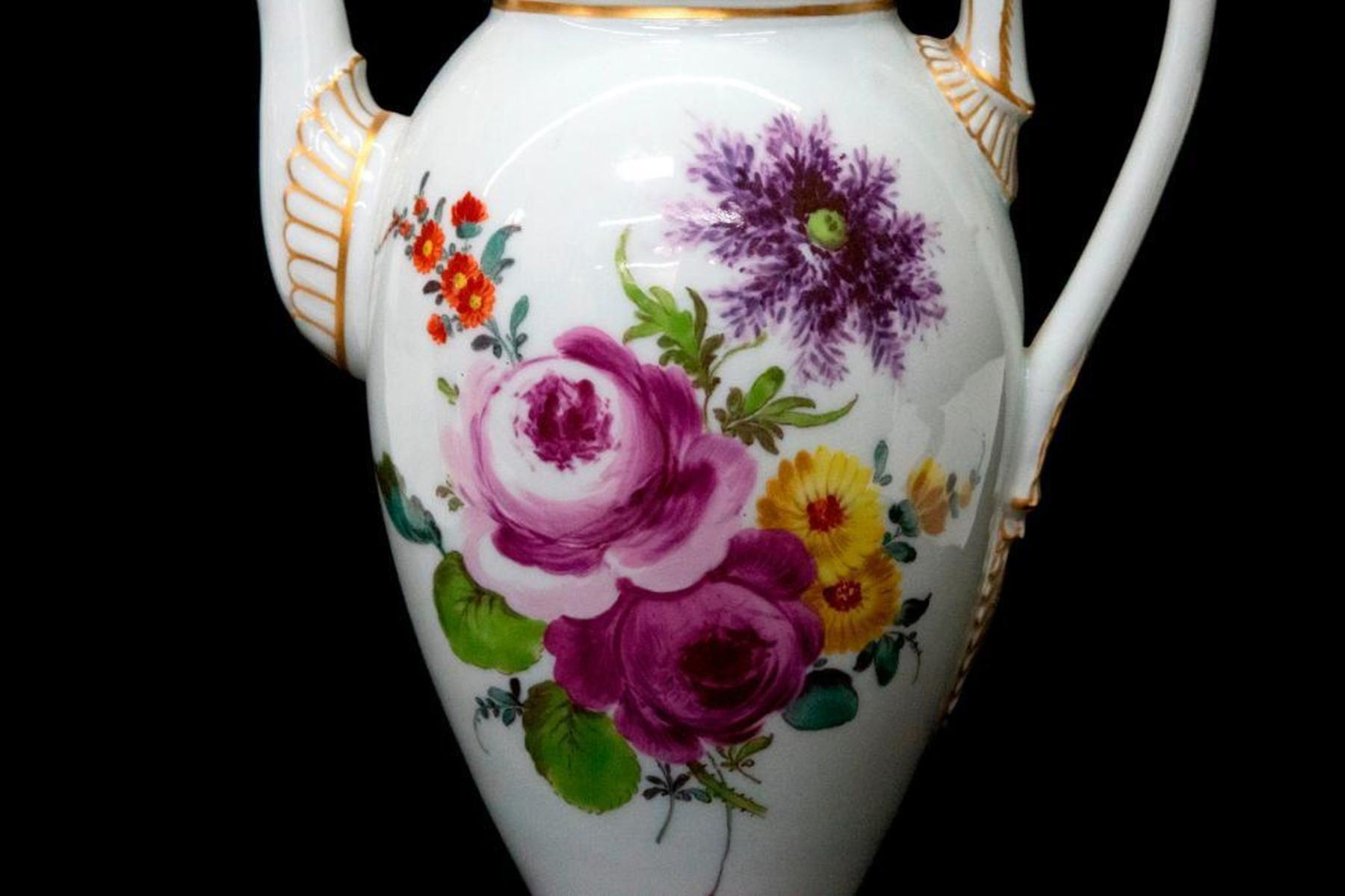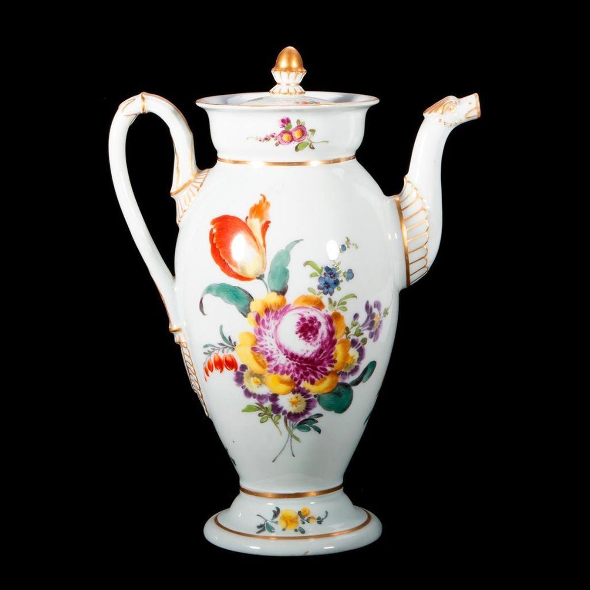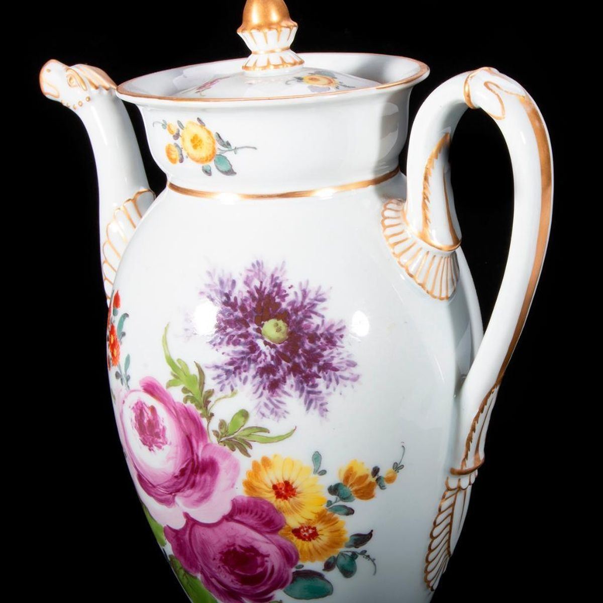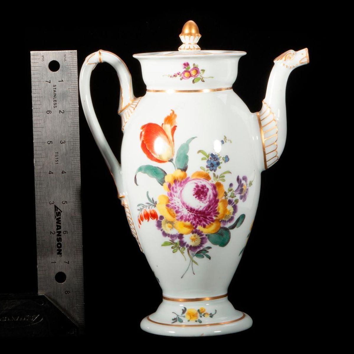 Meissen Coffee Pot with floral painting. Marked with underglazed crossed swords. H-10.5" Excellent condition