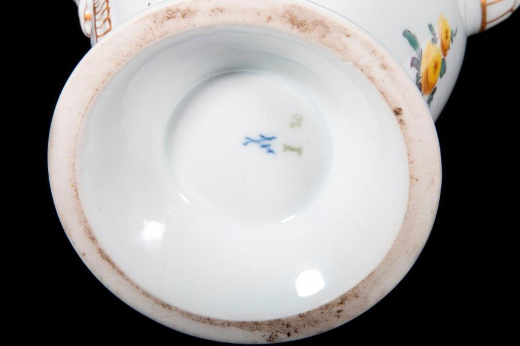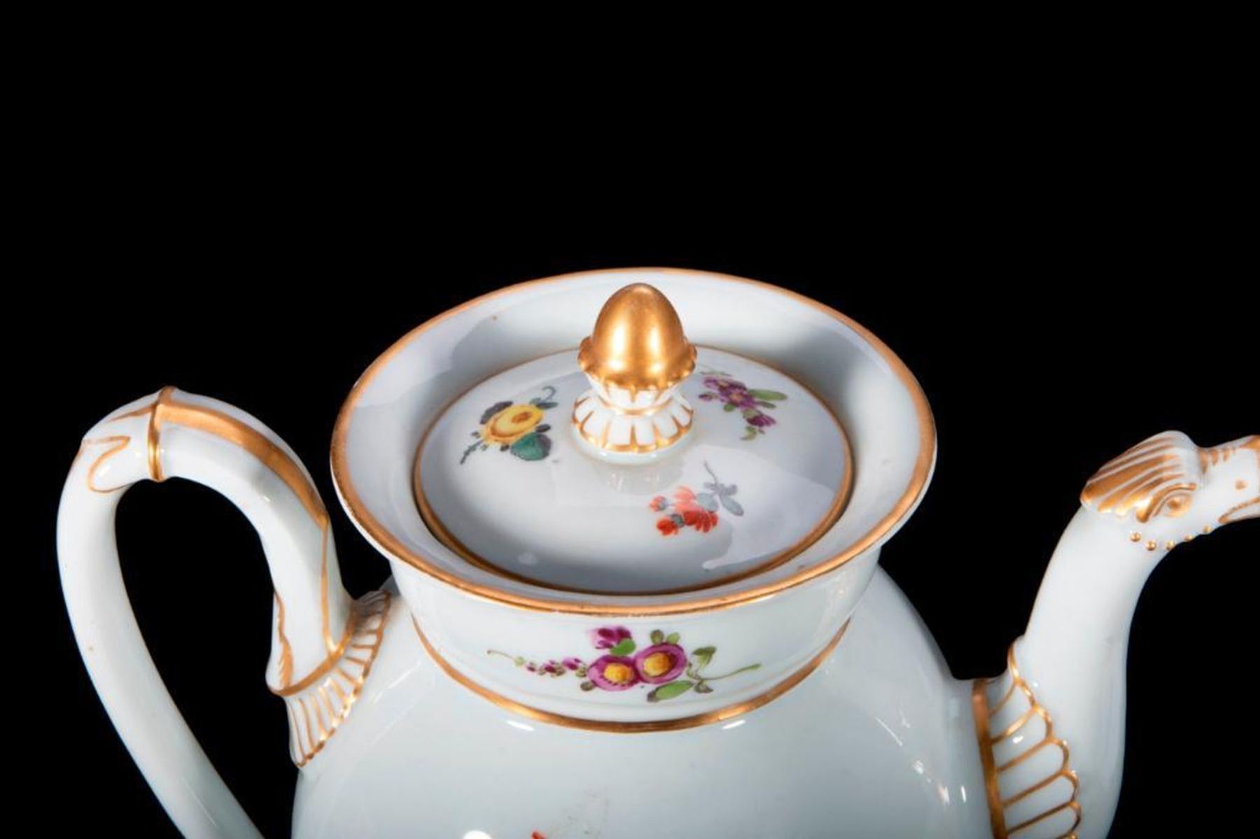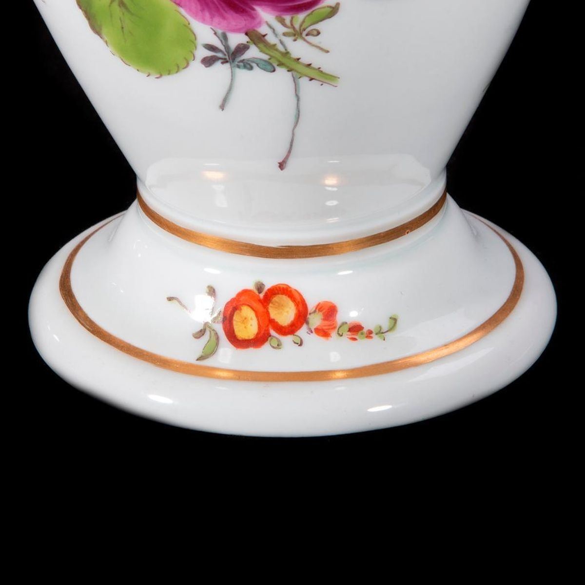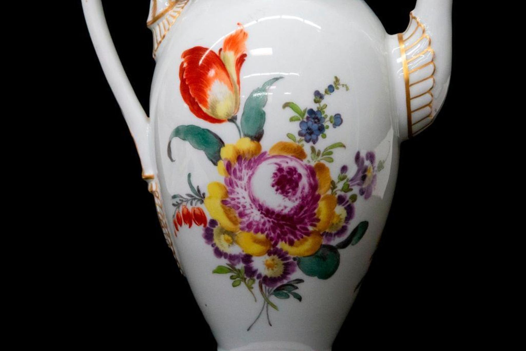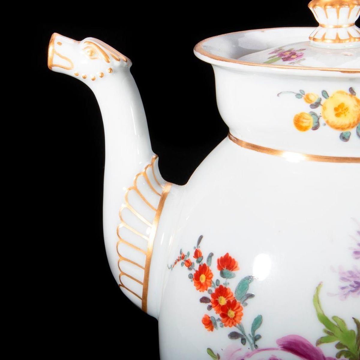 Meissen Coffee Pot with floral painting. Marked with underglazed crossed swords. H-10.5" Excellent condition